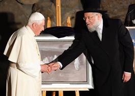 Pápež Benedikt XVI pri podávaní tajným slobodomurárskym spôsobom s vrchným rabínom Lau v Jeruzaleme. |