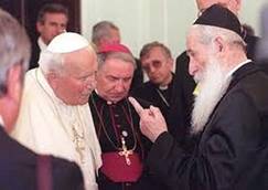 Pápež sa víta s vrchným rabínom Ríma, ako pred jeho prihovorom k zhromaždeným rabínom. Pápež ubezpečil Židov, že katolícka cirkev sa zmenila a teraz podporuje doktrínu judaizmu, že Ježiš neprišiel ako Mesiáš, a Starý zákon je stále v platnosti. |