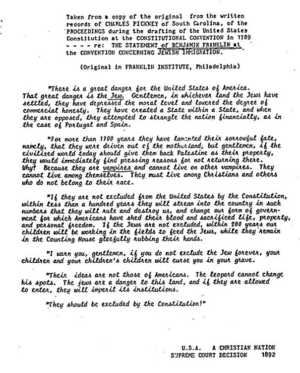 "Ak sa nevylúčia zo Spojených štátov ústavným článkom, o menej ako sto rokov ich príde do tejto krajiny také množstvo, že budú vládnuť a zničia nás a zmenia náš spôsob vládnutia, pre ktorý Američania preliali svoju krv a obetovali životy, majetok a osobnú slobodu. Ak sa Židom povolí vstup, o zhruba 200 rokov budú naše deti pracovať na poliach, aby nakŕmili Židov, zatiaľ čo títo si budú v učtárňach radostne šúchať ruky.