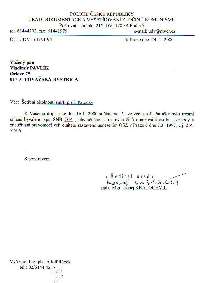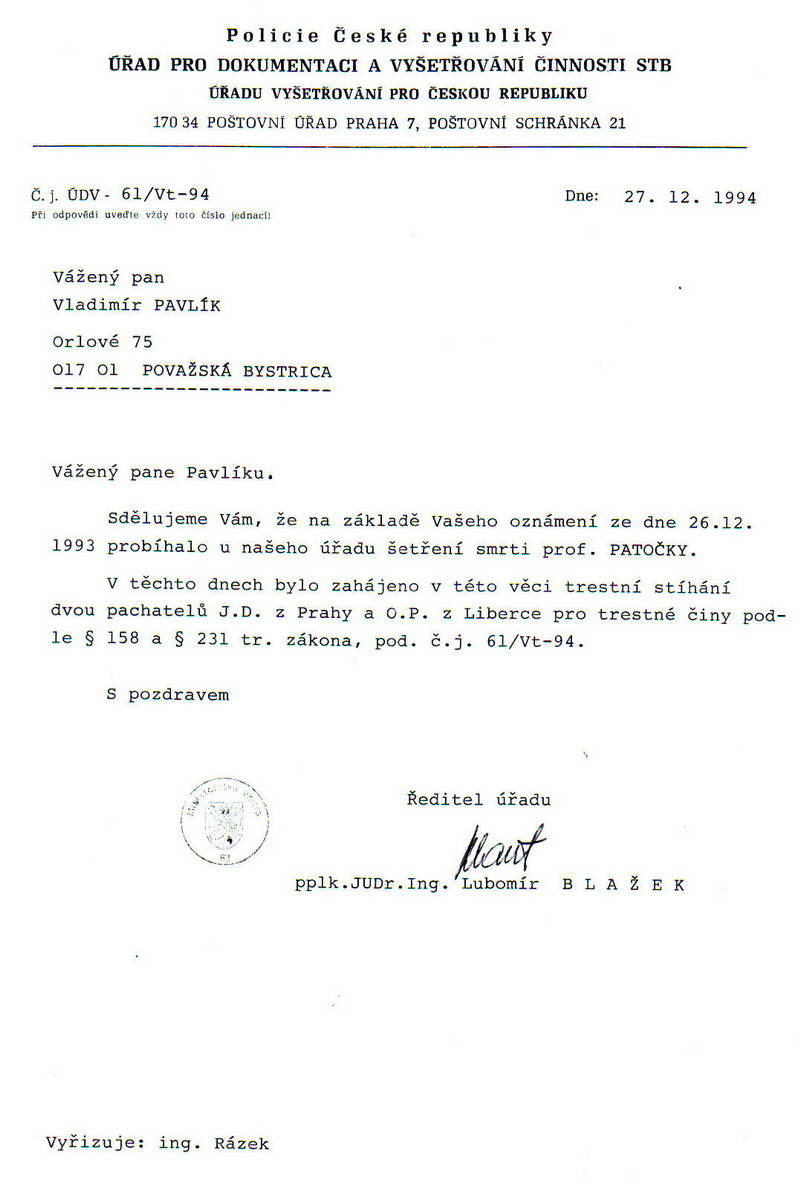Prišiel November 1989 a Václav Havel začal zberať metály a ocenenia, ktoré, pokiaľ by mal len trochu morálky a charakteru, tak by bol musel povedať, „toto nepatrí mne, ale pánu profesorovi Janovi Patočkovi“. On to ale nedokázal povedať, lebo on už bol majstrom republiky v používaní slova „ja“. A tak som čakal niekoľko rokov, a keď Václav Havel nepreukázal ani za mak občianskej cti a statočnosti, aby z titulu svojej funkcie sa zasadzoval o to, aby tí, ktorí pána profesora Jana Patočku dohnali k smrti, boli braní na zodpovednosť, rozhodol som sa konať ako individuálna osoba. Miesto opisovania podrobností predkladám dva autentické dokumenty z 27. 12. 1994 a z 24. 1. 2000. A nech si po prečítaní týchto autentických dokumentov čitatelia položia otázku: prečo Václav Havel a ostatná chartistická nomenklatúra nevyvíjali žiadnu iniciatívu v tejto kauze? Mohol by som odpovedať, lenže tá odpoveď by bola príliš šokujúca – a keďže Václav Havel už nemá možnosť sa brániť, tak radšej mlčím. No nemôžem mlčať o jednom, ako som ho žiadal o pomoc, aby využil silu svojej autority, keď som v roku 1994 podával dotyčné trestné oznámenie. Odpoveď som nedostal. Nechcem tu teraz rozoberať či jeho vinou, alebo či sa tá moja žiadosť vôbec k nemu nedostala. Veď mal okolo seba dosť eštebákov a ich konfidentov.