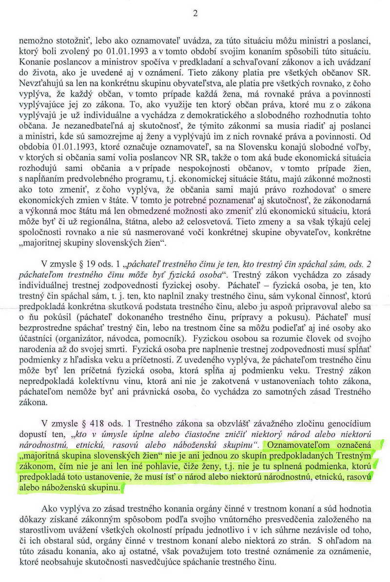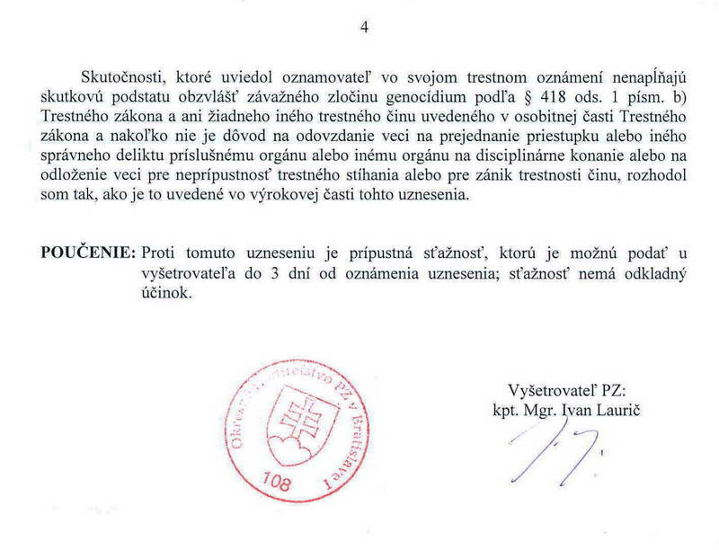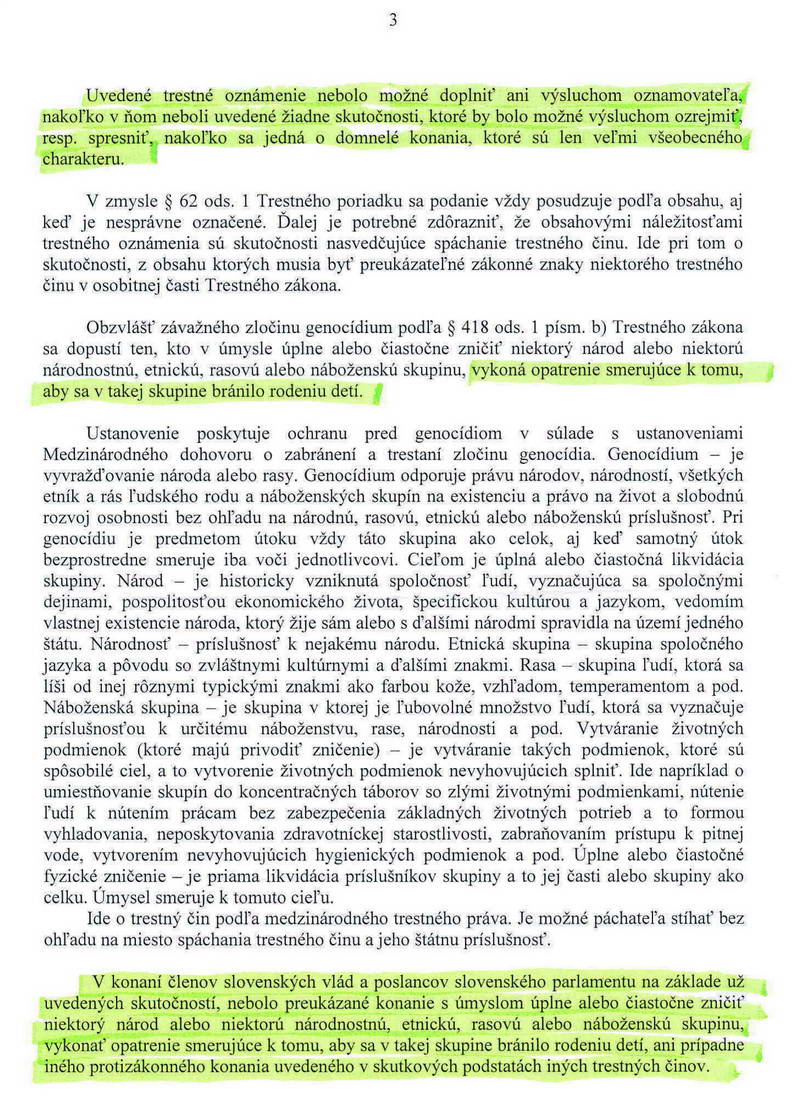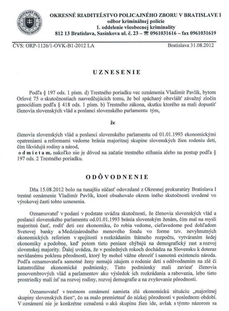 Pokračovanie trestného oznámenia ohľadom genocídy na slovenských politikovV prvej polovici júna 2012 som podal trestné oznámenie podľa § 418, odsek (1), písm. b) – Genocídium na členov ponovembrových vlád a parlamentov od 1. januára 1993. Dnes uverejňujem uznesenie Okresného riaditeľstva Policajného zboru v Bratislave 1, odbor kriminálnej polície, 1. oddelenie všeobecnej kriminality, moju sťažnosť voči tomuto uzneseniu a uznesenie Okresnej prokuratúry Bratislava 1. Vzhľadom k tomu, ako ma dotyčná prokuratúra upozornila, že náš právny poriadok nepozná princíp kolektívnej viny, s čím som sa stotožnil, budem pripravovať nové trestné oznámenie na konkrétne osoby, ktoré na tomto nesú hlavný diel viny: na troch slovenských premiérov Mečiara, Dzurindu a Fica, ako aj na troch predsedov slovenského parlamentu Gašparoviča, Hrušovského a Pašku. Súčasťou tohto trestného oznámenia bude aj návrh na vyšetrenie duševného stavu všetkých šiestich politikov, aby kolégium psychiatrov posúdilo, či menovaní boli či neboli schopní pochopiť, rozpoznať a posúdiť, že tie rozkradnuté stovky a stovky miliárd ktoré sa tu dlhodobo, vedome a cieľavedome rozkrádali a rozkrádajú počas ich funkcií, či dokonca podľa deravých zákonov, za ktoré ako premiéri či predsedovia parlamentov nesú zodpovednosť, či raz, v konečnom dôsledku tohto bezbrehého rozkrádania, nebudú chýbať na podporu a rozvoj slovenskej demografie, na podporu slovenskej rodiny.Vladimír Pavlík ![]() ![]()