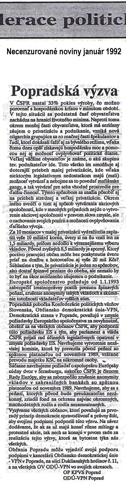 Po vyše dvadsiatich rokoch uverejňujeme aj Popradskú výzvu,pôvodne publikovanú v "Necenzurovaných novinách" a periodiku" Verejnosť", ktorú v roku 1992 verejnosť na Slovensku odignorovala, rovnako ako referendum o preukazovaní pôvodu majetku v roku 1994.