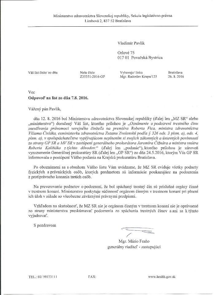 Vážené vedenie Ministerstva zdravotníctva SR, medzi najodpornejšie zločiny proti ľudskosti patrí vykrádanie zdravotníctva, kde následky sú veľmi kruté, keď kvôli tomu každoročne predčasne zomrie niekoľko tisíc nevinných ľudí, ktorí by mohli žiť. Za tieto odporné zločiny nesú hlavnú zodpovednosť premiéri, ktorí boli najdlhšie vo svojich funkciách, o týchto zločinoch vedeli, no mlčali. Jedná sa o Vladimíra Mečiara, Mikuláša Dzurindu a Roberta Fica. Čo je ešte ale zavrhnutia hodnejšie, tí čo zdravotníctvo vykrádali, veľmi dobre vedeli, aké to bude mať následky, no napriek tomu tak robili, čomu sa ani nesnažili zabrániť doterajší ministri zdravotníctva. To že o tom veľmi dobre vedeli, svedčí aj svedectvo bývalého ministra zdravotníctva Rudolfa Zajaca, ktoré Vám posielam ako prílohu, ktorá je súčasťou môjho trestného oznámenia ohľadom vykrádania zdravotníctva na konkrétne osoby v politických funkciách z 8. 5. 2016.. Mňa by zaujímalo, prečo doteraz ministerstvo zdravotníctva nezaujalo k týmto zločincom – vykrádačom, odborné stanovisko z psychologického a psychiatrického hľadiska. Nemusím byť ani odborník na zdravotníctvo, ale dobre viem, že dotyční, vrátane troch premiérov, ktorých som menoval, museli trpieť viacerými úchylkami psychopatizmu a sadizmu, čo sa vzťahuje aj na ostatných ministrov zdravotníctva, ministrov vnútra a generálnych prokurátorov. Preto sa pýtam, dokedy chce byť ministerstvo zdravotníctva v pozícii psychopata a sadistu a spolupodieľať sa na týchto zločinoch proti ľudskosti? Vzhľadom na tisíce a tisíce nevinných obetí, pokiaľ sa to vynásobí krát 23 rokov, tak už sú v pozícii masových vrahov.