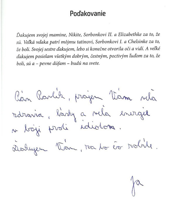 Dovoľujem si odcitovať niektoré pasáže z dotyčnej knihy, lebo si taktiež myslím, že s myšlienkami autora sa dnes stotožňuje cca 70-80 % slovenských občanov. Na strane 5, autor píše – Táto kniha vznikla 25 rokov po Nežnej revolúcii (komédii). Inšpiráciou na jej napísanie boli vystúpenia veľkých vodcov revolúcie v televízii práve na jej 25. výročie. Ide o reálno-fakticko-politické rozprávanie o pocitoch a sklamaniach jedného revolucionára, ktorý – ako mnoho ďalších – „bojoval“ v uliciach počas Nežnej revolúcie, teda v časoch, keď sa veľkí revolucionári ukazovali v televízii, médiách, uzatvárali tajné dohody a rozdeľovali si funkcie. Na strane 75 autor prakticky vo forme otázok rekapituluje všetko to, o čom v knihe napísal, citujem – Je 25 rokov po Nežnej revolúcii, na ktorej som sa aktívne zúčastňoval a ja si dlhé roky kladiem otázku: „STÁL SOM NA SPRÁVNEJ STRANE BARIKÁDY?“ Keby som vtedy vedel, ako sa začne kradnúť, tunelovať, že sa vytratí slušnosť, charakter a česť, že tu budú vládnuť ľudia bez chrbtovej kosti, že čím bude človek väčší hajzeľ, tým sa bude mať lepšie, tak neviem, či by nebolo lepšie, keby som radšej vtedy zobral do ruky lopatu a bil by som študentov a pomáhal príslušníkom Verejnej bezpečnosti s potláčaním demonštrácií. Václav Havel sa vyjadril v roku 1990 krátko po Nežnej revolúcii: „Pravda a láska zvítězila nad lží a nenávisti.“ Nebudem asi jediný, kto si myslí, že „AROGANTNÍ, PRIMITÍVNI, BEZCHARAKTERNÍ ZLODEJI A PODVODNÍCI ZVÍŤAZILI NAD LŽOU A NENÁVISŤOU.“ Na poslednej strane 77 je P.S.: V knihe sú prezentované moje myšlienky a názory. Samozrejme, nemusíte s nimi súhlasiť, ale čo sa týka beztrestného rozkrádania štátu, vytunelovania fabrík, ktoré vybudovali naši rodičia, korupcii, slabej vymožiteľnosti práva a pravdy na súdoch a polícii, chabého charakteru v parlamente a vo vláde, čo sa týka zhoršenia medziľudských vzťahov, straty cti, čestnosti a slušnosti medzi ľuďmi, tak to nie sú len moje názory, ale realita na Slovensku. Vladimír Pavlík |