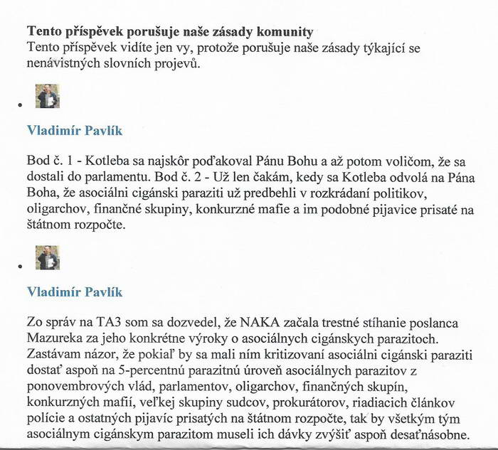 Jeden neanonymný Benčík je omnoho viac charakterný, ako stovky anonymných a zákerne udávajúcich kotlebovcov Patrím medzi tých jedincov, ktorý nikdy nenapísal nielen anonym, trebárs vo forme nejakej sťažnosti, poslanej nejakému štátnemu orgánu. Dokonca som ani raz za tie roky, čo som na facebooku, nikoho nenahlásil, aby bol zablokovaný. Viem, že sme v absolútnej menšine voči gaunerom a hajzľom z kiskoidnej skupiny, siskárskej skupiny, kotlebovskej skupiny, tomuto súhrnu anonymných zbabelcov, pôsobiacich na facebooku, ktorí majú udávanie nielen v génoch, nielen od svojich rodičov, ale aj starých rodičov či prastarých rodičov. Samozrejme, že tu fungujú aj iné tlupy takýchto anonymných udavačov, no tie tri skupiny, čo som vymenoval, patria medzi absolútnu špičku. Aká svoloč, spodina, luza a zberby z vysokej politiky tu chcú bojovať proti fašizmu, extrémizmu, rasizmu, xenofóbii, šíreniu bludov a nenávisti voči Rómom, keď sa nečinne prizerajú, ako siskárski a kiskoidní hajzli sliediaci a blokujúci na facebooku otvorene a priamo podporujú Kotlebu a jeho súkmeňovcov? Názorný príklad som uviedol v poslednom článku na www.necenzurovane.net a teraz pridám ďalšie dva príspevky, ktoré sú súčasťou článku, za ktoré som bol v júli zo strany siskárskych a kiskoidných hajzľov zablokovaný na základe udania kotlebovských anonymných udavačov na 30 dní, keďže títo sa otvorene stotožnili s kotlebovskými udavačmi, lebo vraj tieto dva moje príspevky porušujú zásady fašistického slovenského facebooku, týkajúce sa nenávistných prejavov. Možno si plným právom položiť otázku: akí gauneri a hajzli riadia tento štát, keď im toto neprekáža? Vlastne, prečo by im to malo prekážať, špinavým vyvrheľom, ktorí každoročne cez vykrádanie zdravotníctva doženú k predčasnej smrti tisíce nevinných občanov? Tak prečo by Kotleba za svoje mlčanie a zbabelosť ohľadom týchto zločinov proti ľudskosti, verejne hovoriť, nemal by byť odmenený? Vladimír Pavlík
