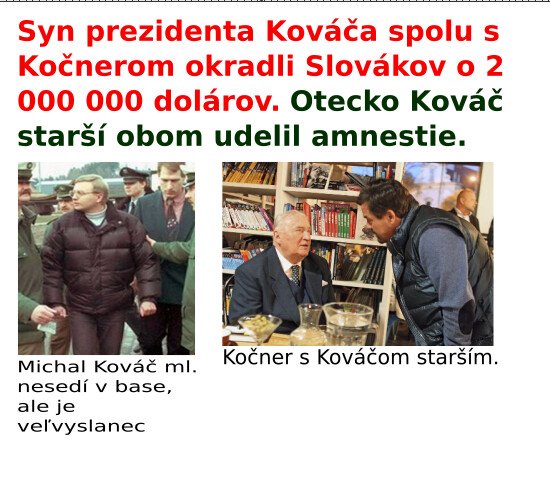 Nespomína sa už, že Kočner bol pečený - varený u prezidenta Michala Kováča, ktorý mu udelil tri milosti za obyčajné prasprosté trestné činy, dokonca jeden spáchal Kočner v organizovanej skupine so synom prezidenta Michalom Kováčom mladším. Hovorilo sa vtedy, že ide o kšefty Michala Kováča staršieho, ktorý ich ako prezident uskutočňuje cez svojho syna, ale to sa zamietlo pod koberec.