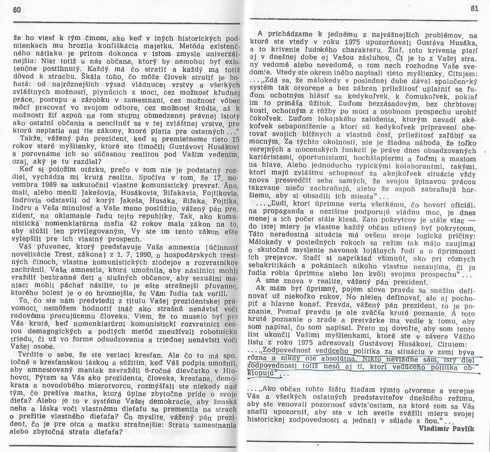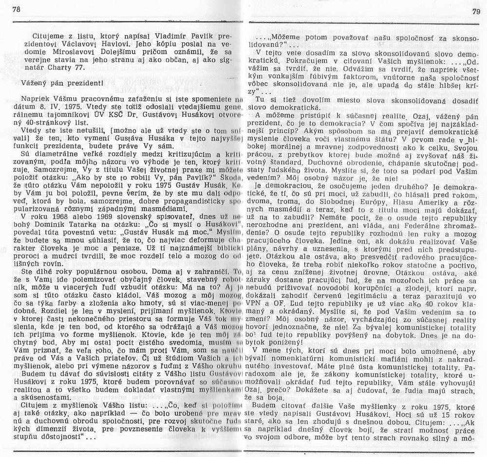 Môj list odoslaný v roku 1991 Václavovi Havlovi, ktorým reagujem na súčasné divadlo okolo Havlovho listu Gustávovi Husákovi z roku 1975https://twitter.com/VladimirPavlik1https://vk.com/vlado.pavlik V súvislosti so zamatovým novembrovým podvodom spred tridsiatich rokov sa v rámci budovania nových falošných mýtov s veľkou pompou pripravuje veľké absurdné divadlo o „hrdinstve“ Václava Havla voči prezidentovi Gustávovi Husákovi, ktorým má byť Havlov list z roku 1975. Pre porovnanie tu zverejňujem môj list, ktorý som Václavovi Havlovi poslal v roku 1991, ktorý je súčasťou knihy Miroslava Dolejšiho s výstižným názvom „Svätosti temnôt“. V tomto liste som polemizoval s textom listu, ktorý poslal v roku 1975 Gustávovi Husákovi. Aj ja som súdruhovi Husákovi v časoch normalizácie poslal otvorený, rukou písaný list cez kopirák, kde som sa ho slušne pýtal, prečo hanobí jazyk matky, ktorá ho porodila. Pripomenul som mu, že aj ja od roku 1969 robím v Čechách a na Morave, hovorím len a len slovensky, neprzním ho systémom jedno české slovo, jedno slovenské slovo, že nikto ma tu za to neprenasleduje, ani sa mi nevysmieva, ani ma nediskriminuje. To čo sa začalo diať po jeho odoslaní, radšej tu nebudem spomínať, lebo by som musel vystaviť krutú vizitku zbabelému protislovenskému odpadu, mlčiacemu do roku 1989, ktorý sa po Novembri 1989 SAMOPASOVAL za najslovenskejších Slovákov a najnárodnejších národniarov, len aby mohli rozkradnúť v mene Boha, národa a Slovenska to, čo oni nikdy nevybudovali. Vladimír Pavlík Václav Havel: List Gustávovi HusákoviNetradičné predstavenie k 30. výročiu Nežnej revolúciePremiéra