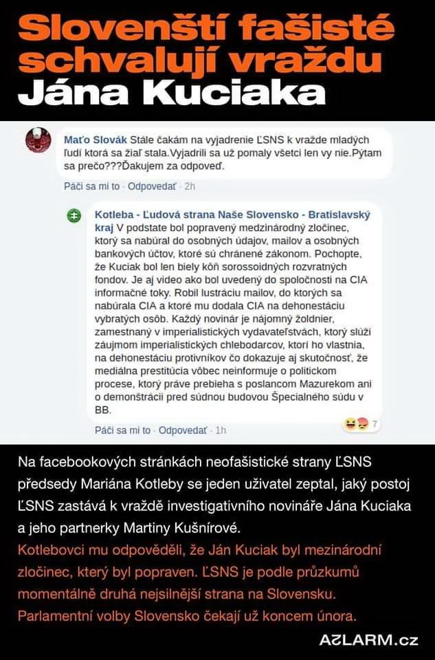 "V podstate bol popravený medzinárodný zločinec, ktorý sa nabúral do osobných údajov, mailov a osobných bankových účtov, ktoré sú chránené zákonom. Pochopte, že Kuciak bol len biely kôň sorossoidných rozvratných fondov. Je aj video ako bol uvedený do spoločnosti na CIA informačné toky. Robil lustráciu mailov, do ktorých sa nabúrala CIA a ktoré mu dodal CIA na dehonestáciu vybraných osôb. Každý novinár je nájomný žoldnier, zamestnaný v imperialistických vydavateľstvách, ktorý slúži záujmom imperialistických chlebodarcov, ktorí ho vlastnia, na dehonestáciu protivníkov čo dokazuje aj skutočnosť, že mediálna prestitúcia vôbec neinformuje o politickom procese, ktorý práve prebieha s poslancom Mazurekom ani o demonštrácii pred súdnou budovou Špecializovaného súdu v BB."