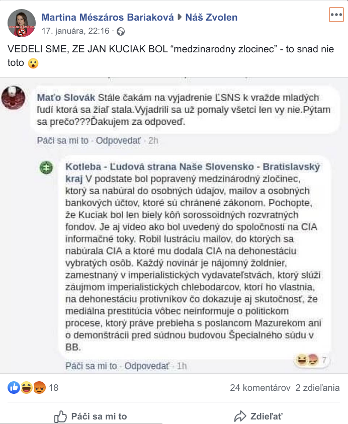 Internet v posledných dňoch obletela staršia fotka, kde sa ĽSNS vyjadrovala k Jánovi Kuciakovi. V diskusii na sociálnej sieti ho nazvala medzinárodným zločincom, bielym koňom Sorošových fondov či človekom, ktorý bol napojený na CIA. Aký na to mali dôvod?