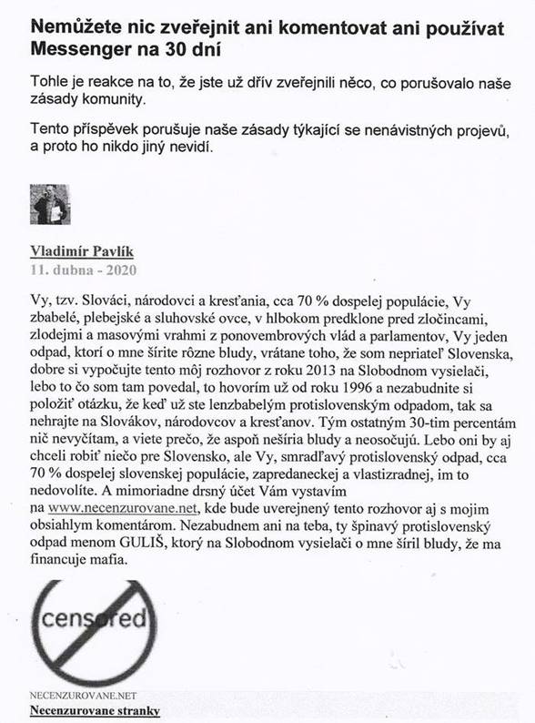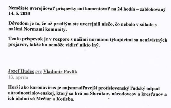 Po 33. raz po sebe som bol zablokovaný za tento príspevok z 11. 4. 2020, ba dokonca bol zablokovaný aj istý Jozef Hudec, ktorý túto jednu vetu poslal na môj profil.