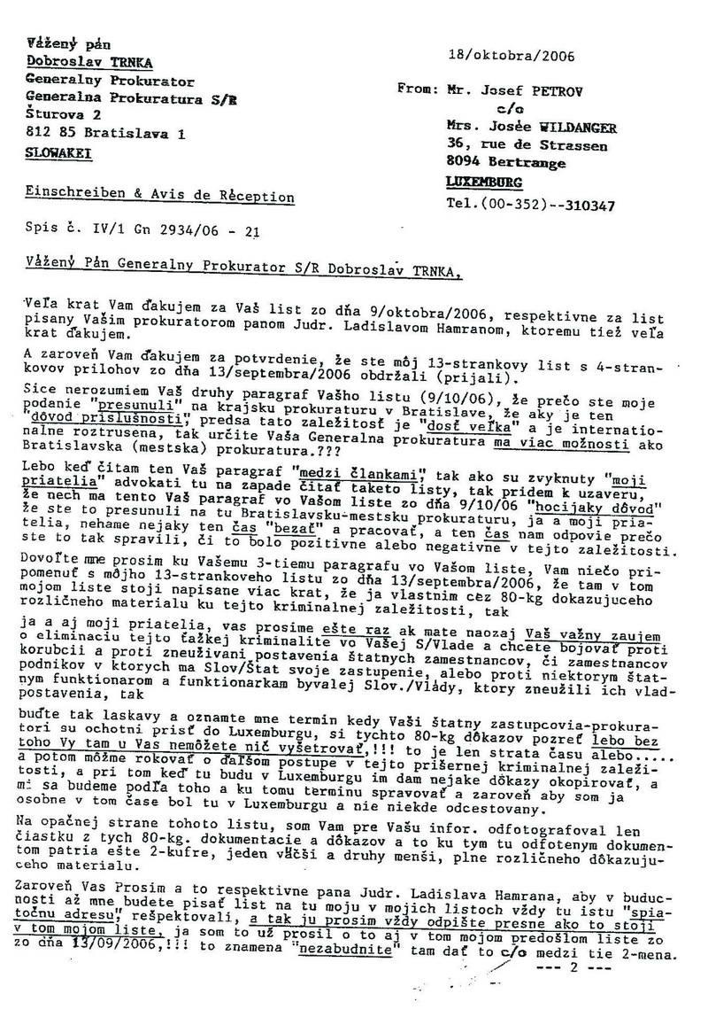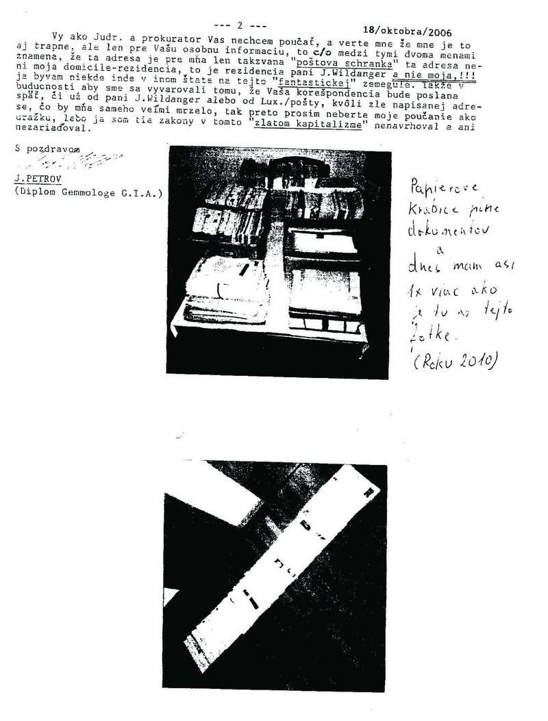 Možno konštatovať, že kauza diamantovej bane, aj napriek povinnému a jednostrannému mlčaniu politických a novinárskych špičiek, presvedčila veľké množstvo slovenskej populácie o jej hodnovernosti. Zbytočne súhrn treťotriedneho ekonomického diletanta a špičkového ekonomického zločinca Ivan Mikloš doporučuje Jozefovi Petrovovi a Vladimírovi Pavlíkovi návštevu lekára, keď nie je schopný uviesť ani jediný protiargument, ktorý by túto kauzu na www.diamantovabana.sk vyvrátil. Aký to paradox, keď tento tzv. ekonóm, ktorého skutočné ekonomické vedomosti nedosahujú ani úroveň absolventa strednej ekonomickej školy, bude s najväčšou pravdepodobnosťou riadiť Ministerstvo financií SR a svoju tupohlavosť a diletantstvo bude prenášať na plecia občanov, za zločiny a zlodejstvá napáchané samotnými politikmi, ich mecenášmi či kadejakými zbojníckymi finančnými zberbami. Nepochybne lichvári zo Svetovej banky a Medzinárodného menového fondu sa už musia nesmierne tešiť, ako aj cez Ivana Mikloša budú môcť opätovne realizovať ekonomický fašizmus na slovenských občanoch, kde ponížená slovenská pravica im bude plne k dispozícii. A SOFISTIKOVANÉ FAŠISTICKÉ ZLOČINY PROTI ĽUDSKOSTI TU BUDÚ PREZENTOVANÉ AKO NEVYHNUTNÉ EKONOMICKÉ REFORMY. Úbohý to ekonóm, ktorý doteraz nedokázal vysvetliť „rozdiely“, či skôr SPOLOČNÉ ZNAKY medzi rozkradnutými miliardami a miliardami, ktoré si Slovensko požičiava zo zahraničia. Našim čitateľom predkladám ďalší zaujímavý dokument z 18. októbra 2006. Jedná sa o list pána Petrova Generálnemu prokurátorovi Dobroslavovi Trnkovi, kde je aj takáto pasáž: ...buďte tak láskavý a oznámte mne termín, kedy Vaši štátni zástupcovia – prokurátori sú ochotní prísť do Luxemburska, si z týchto 80 kg dôkazov pozrieť, lebo bez toho Vy tam u Vás nemôžete nič vyšetrovať!!!, to je len strata času...“ Treba ešte pripomenúť tzv. charaktery niektorých zbojníkov z kauzy diamantovej bane pri okradnutí slovenského národa, keď tieto komunistické a eštebácke zberby, nevediac, že pán Petrov bol v tom období špičkovým agentom tajnej služby JAR, sa ho dokonca rozhodli okradnúť aj o províziu, ktorá bola úradne napísaná a podpísaná. Akú mienku si môžu čitatelia urobiť o týchto chrapúňoch, keď pán Petrov im všetko financoval – letecké cesty, ubytovanie v špičkových hoteloch, zabezpečenie perfektného stravovania a ostatných náležitostí k tomu patriacich – a nakoniec takáto odplata? Pán Generálny prokurátor Dobroslav Trnka, nespadá náhodou do Vašej kompetencie verejne povedať slovenskému národu o koľko stoviek miliónov bol doposiaľ v tejto kauze okradnutý? Prečo sa bojíte telemostu medzi Luxemburskom a Slovenskom, kde by sa hovorilo o konkrétnych zlodejstvách, ukázali by sa ďalšie dôkazy, kde bol vedome okradnutý slovenský národ? Veď pán Petrov by Vám po príchode do Luxemburska všetko uhradil, prípadne Vám dopredu poslal peniaze na letenku z Bratislavy do Luxemburska. Vladimír Pavlík