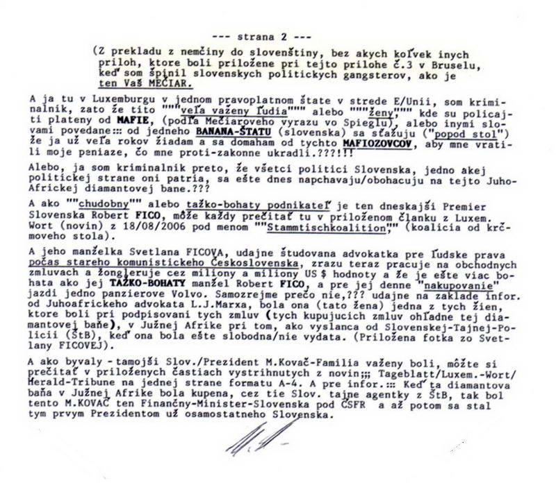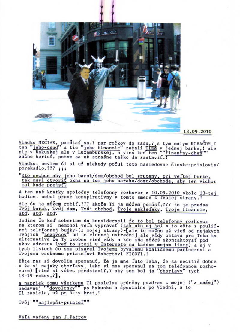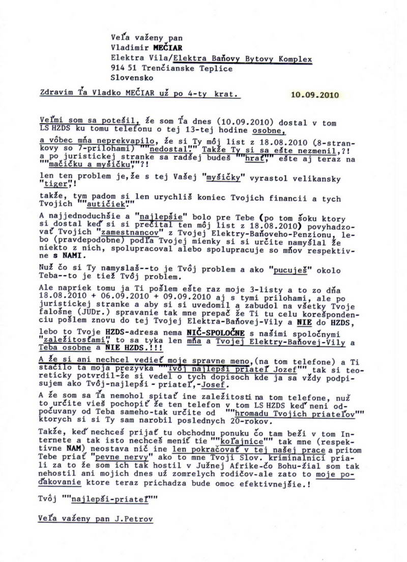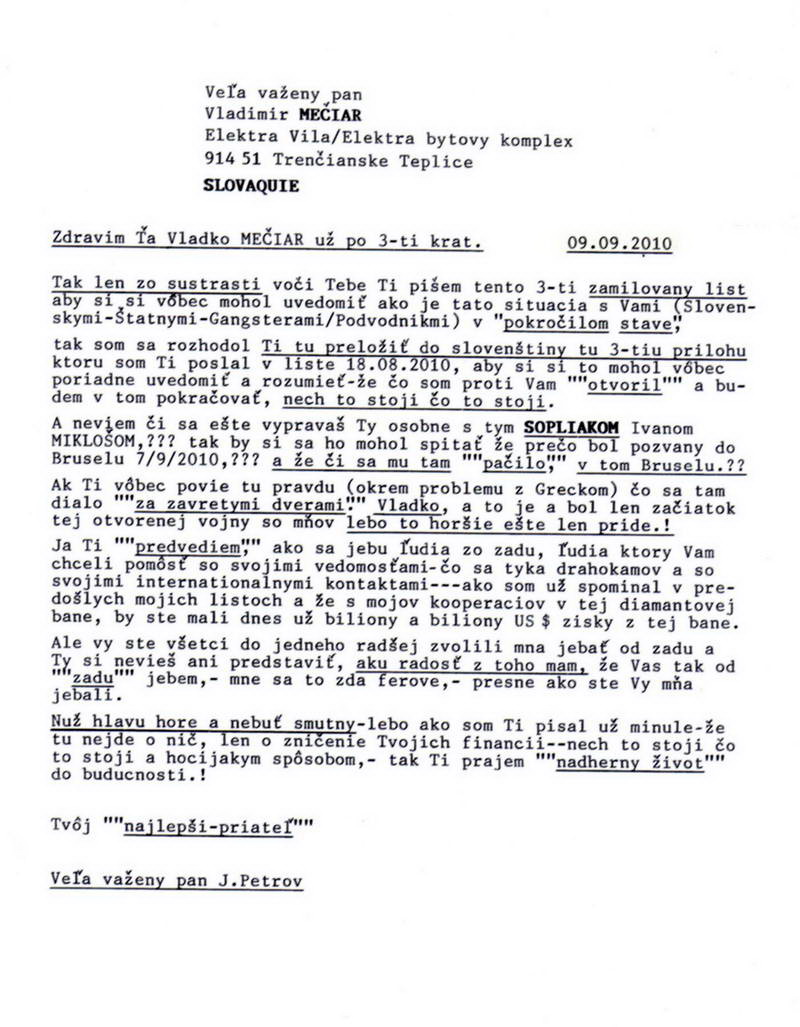 Ja som tak ""príšerne smutný'.'" že si mi neodpísal na moju ""obchodnú ponuku"" z môjho posledného listu z 18.08.2010, ale čo ja už môžem robiť, to sú predsa Tvoje nákladiaky a nie moje a Tvoje "financie" a nie moje, nuž tým pádom Tvoja budúcnosť na Slovensku a nie moja. Veď kedysi Kováč mi to tiež neveril). Nuž tak pri tejto príležitosti by som si dovolil Ti ešte raz zapriať veľa-veľa šťastia a pevne nervy do budúcnosti...presne ako mi ti Slováci tiež priali!!!