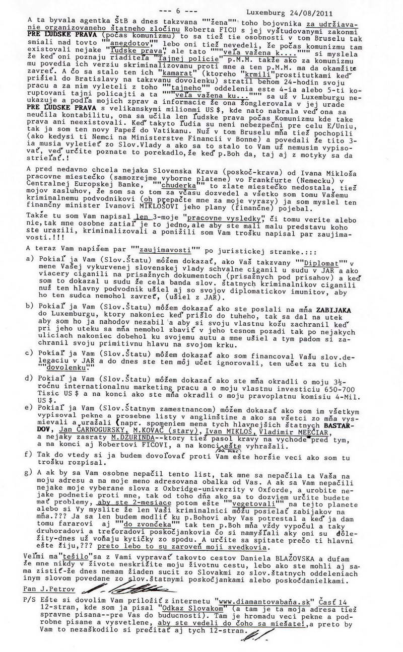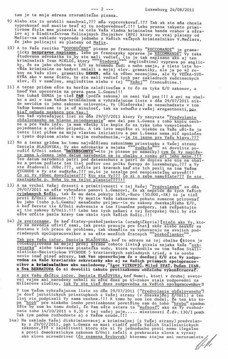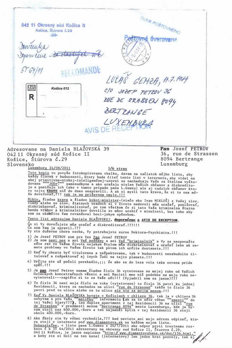 Vážení čitatelia, zdá sa vám úplne normálne ak dostanete zo súdu úradnú zásielku s Vašim menom bez oslovenia a s vašim dátumom narodenia na obálke? Takýmto spôsobom totiž komunistickí sudcovia pred rokom 1989 dávali ostentatívne najavo občanom, že sú pre nich len kriminálnym číslom a potencionálnym materiálom pre väznice. Po pochybnom prevrate v novembri 1989, kedy pokračovala kontinuita totalitnej justície preto vôbec neprekvapuje, že košická sudkyňa JUDr. Daniela Blažovská  v duchu revolučných tradícii odoslala obálku Lukášovi Gemzovi na adresu v Luxemburgu kde sa pridelenia čísla ušlo aj pánovi Jozefovi Petrovovi. Jeho list je preto primeranou reakciou podľa slovenského porekadla „na hrubé vrece-hrubá záplata.“Pre úplnosť uverejňujeme aj žiadosť Lukáša Gemzu o odmietnutie účasti na hlavnom konaní sp. zn. 5T64/2011