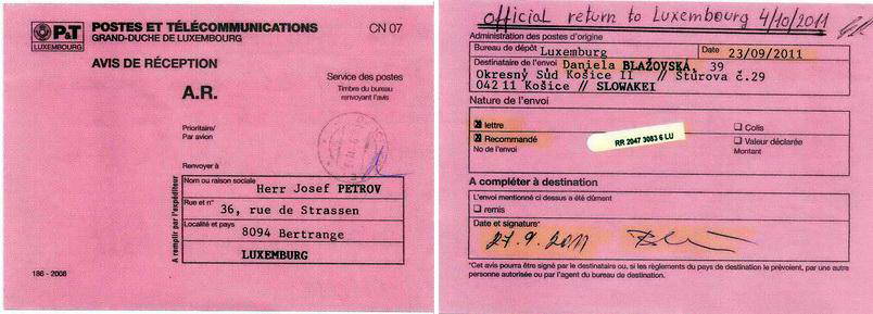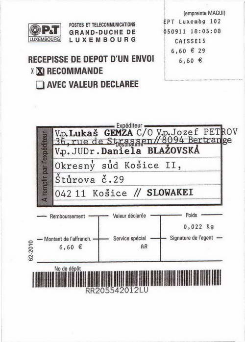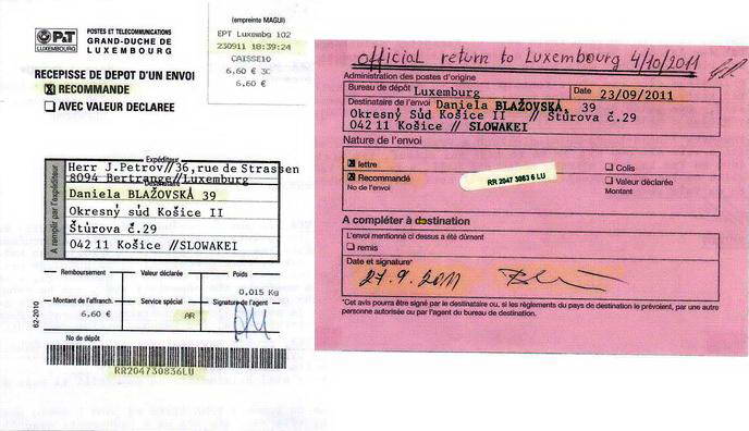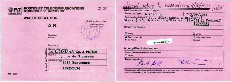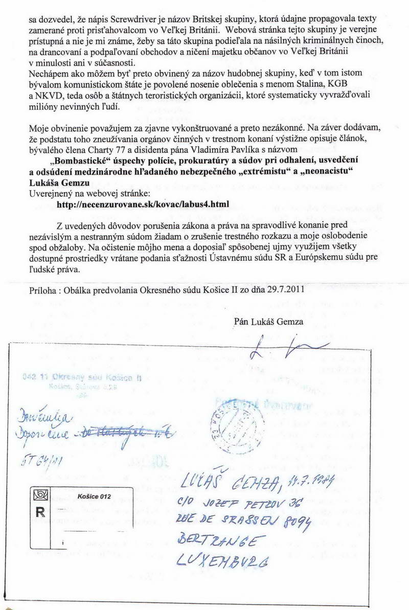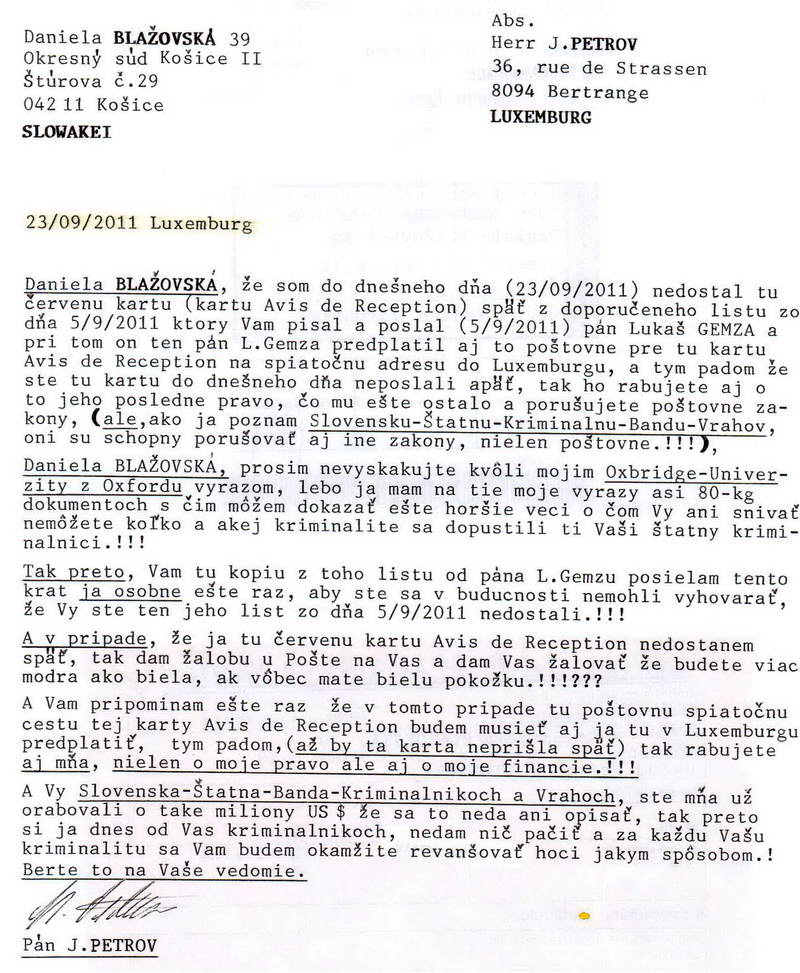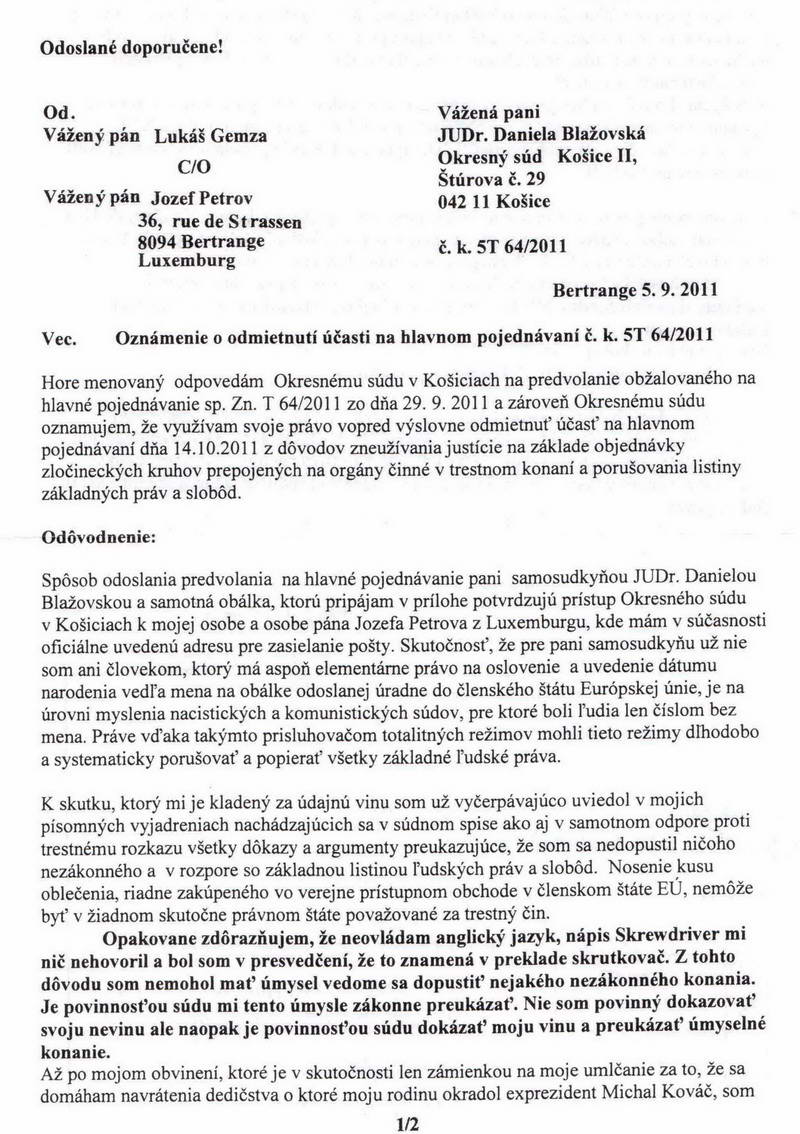 Vážení čitatelia, zdá sa vám úplne normálne ak dostanete zo súdu úradnú zásielku s Vašim menom bez oslovenia a s vašim dátumom narodenia na obálke? Takýmto spôsobom totiž komunistickí sudcovia pred rokom 1989 dávali ostentatívne najavo občanom, že sú pre nich len kriminálnym číslom a potencionálnym materiálom pre väznice. Po pochybnom prevrate v novembri 1989, kedy pokračovala kontinuita totalitnej justície preto vôbec neprekvapuje, že košická sudkyňa JUDr. Daniela Blažovská v duchu revolučných tradícii odoslala obálku Lukášovi Gemzovi na adresu v Luxemburgu kde sa pridelenia čísla ušlo aj pánovi Jozefovi Petrovovi. Jeho list je preto primeranou reakciou podľa slovenského porekadla „na hrubé vrece-hrubá záplata.“Pre úplnosť uverejňujeme aj žiadosť Lukáša Gemzu o odmietnutie účasti na hlavnom konaní sp. zn. 5T64/2011 |