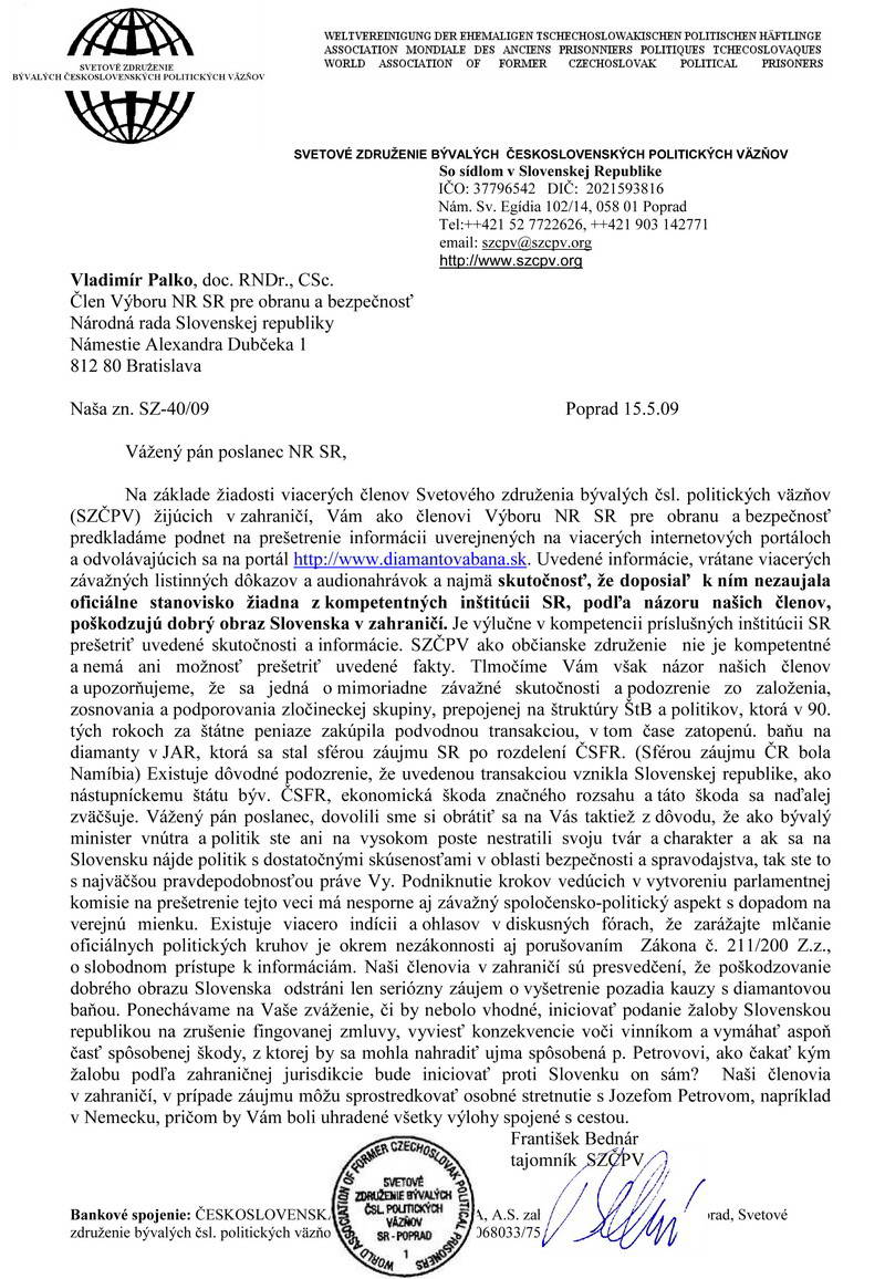 Na požiadanie nášho člena pána Jozefa Petrova sme sa obrátili v roku 2009 na vtedajšieho poslanca NR SR -- člena Výboru NR SR pre obranu a bezpečnosť Vladimíra Palka so žiadosťou, aby sa kompetentní vyjadrili k tejto kauze, pretože je natoľko závažná, že poškodzuje dobré meno Slovenskej republiky v zahraničí. Žiadosť, ktorú pripájame v prílohe, nebola však akceptovaná a nedostali sme žiadnu odpoveď.