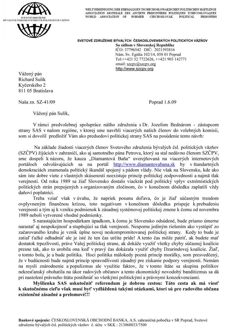 Ďalším dôkazom zbabelosti a pokrytectva je aj postup SAS, ktorej predseda Richard Sulík nenašiel odvahu odpovedať na list tajomníka SZČPV z 1.6.2009. Rovnako sa zachoval aj "obyčajný človek" Igor Matovič, ktorého výstižne charakterizoval ešte v roku 2010 Vladimír Pavlík v príspevku Obyčajný podliak Igor Matovič. http://necenzurovane.sk/10/narcis.html