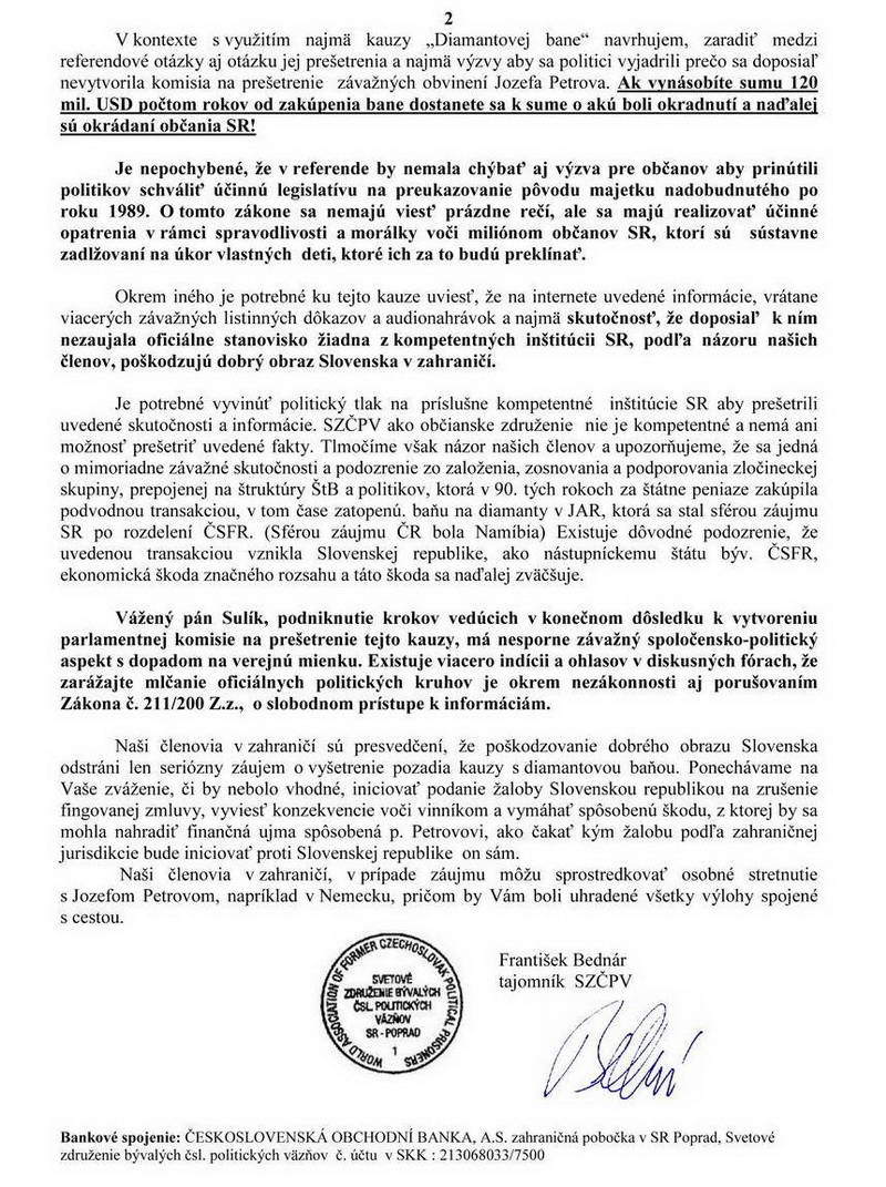 V súvislosti s uvedeným stanoviskom naša organizácia obdržala viacero dotazov týkajúcich sa tejto kauzy a autenticity nami odoslaných listov. SZČPV uverejňuje len oficiálne odoslanú úradnú poštu a nemá žiadny záujem poškodzovať slovenských politikov uverejňovaním nepodložených alebo nepravdivých skutočností. Ďalej oznamujeme, že SZČPV nie je kompetentné poskytovať informácie k tejto veci. Všetky otázky smerujúce k podrobnostiam a okolnostiam transakcie s diamantovou baňou môžete adresovať písomne alebo telefonicky priamo nášmu členovi p. Jozefovi Petrovovi na adresu a telefonický kontakt, ktoré s jeho súhlasom uverejňujeme.