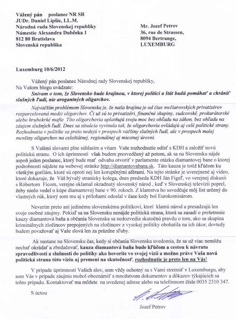 Na adresu Národnej rady SR mu bol dňa 10. júna 2012 odoslaný doporučený list pána Jozefa Petrova s doručenkou do vlastných rúk, ktorý uverejňujeme aj s podacím lístkom, ako ďalší dôkaz zbabelého farizejstva politikov, skrývajúcich sa za masku kresťanstva. Spolu s úlisným a ustrašeným servilným ex-eurokomisárom Jánom Figelom, ktorý bohapusto klamal pred slovenským národom, priamo v sviatok pána, v priamom prenose STV, v nedeľnej relácii „ O 5 minút 12“, sa Daniel Lipšic definitívne zaradil medzi zbabelcov, ktorý nedokážu nič iné, len tárať a klamať vlastný národ.