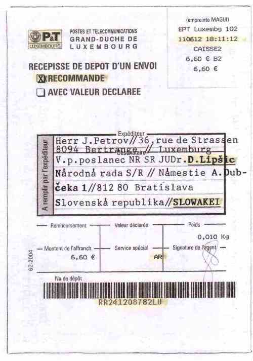 Pre informáciu je potrebné uviesť, že potvrdenie o doručení listu na adresu pána Jozefa Petrova neprišlo, z čoho je zrejme, že Daniel Lipšic neprejavil ani elementárnu slušnosť list prevziať a odpovedať odosielateľovi. Rovnako NR SR potvrdila svoju povesť špičkovej zločineckej organizácie, ktorá nerešpektuje ani základné poštové zákony platné v EÚ, ktorej tak servilne a horlivo prisluhuje, rovnako ako pred rokom 1989 komunistickí zločinci prisluhovali Moskve.