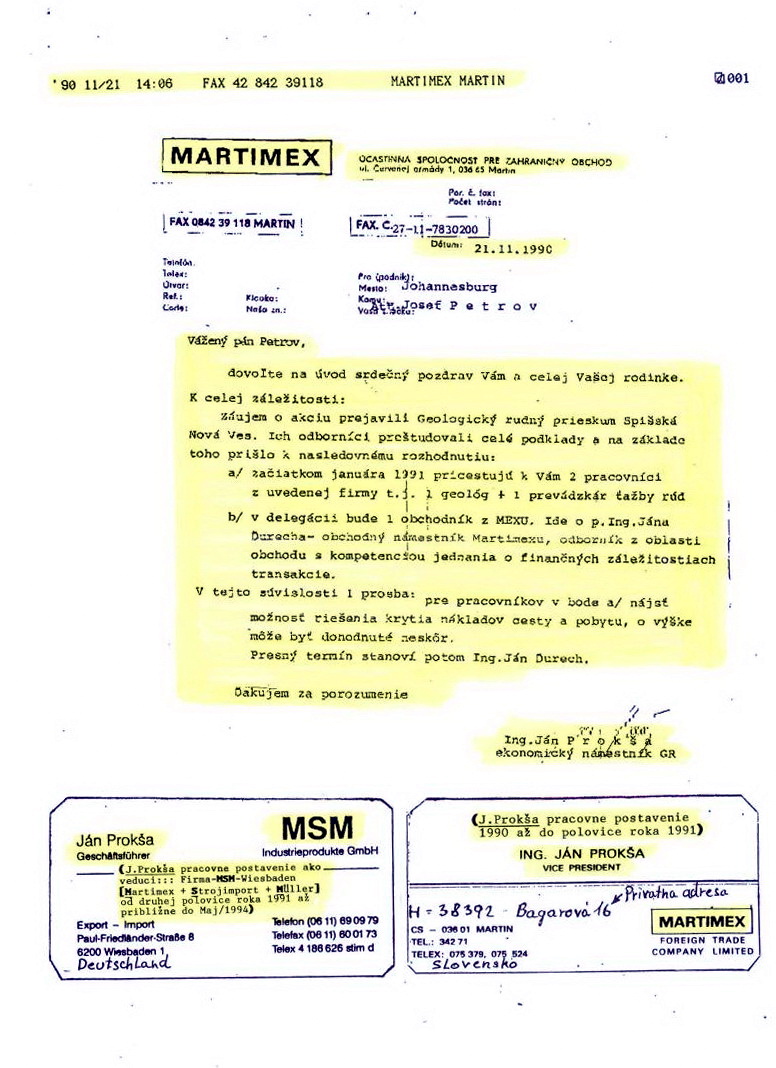 - text faxovej správy, ktorú dňa 21. 11. 1990 posiela pánu Petrovovi do Johanesburgu ekonomický námestník riaditeľa MARTIMEXU Ing. Ján Prokša