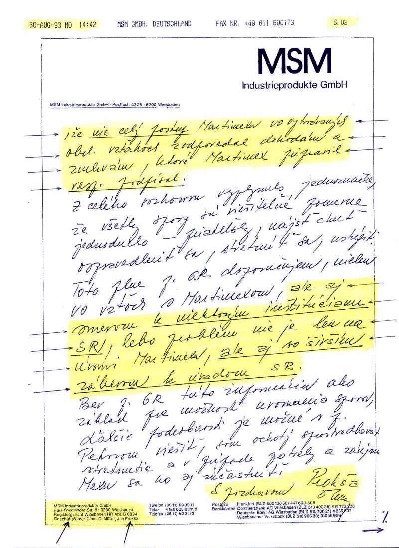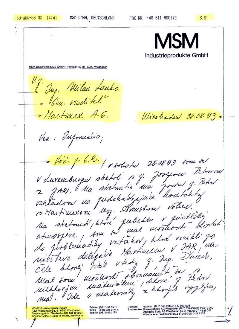 Faxová správa z 30. 8. 1993 od Ing. Jána Prokšu, ktorý v tom období zastupoval záujmy MARTIMEXU vo Wiesbadene, generálnemu riaditeľovi Ing. Milanovi Laukovi