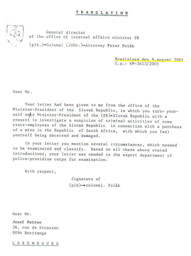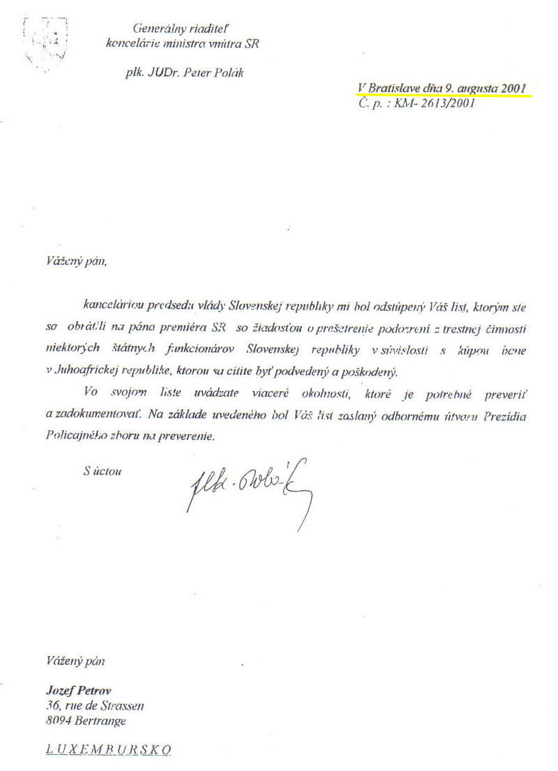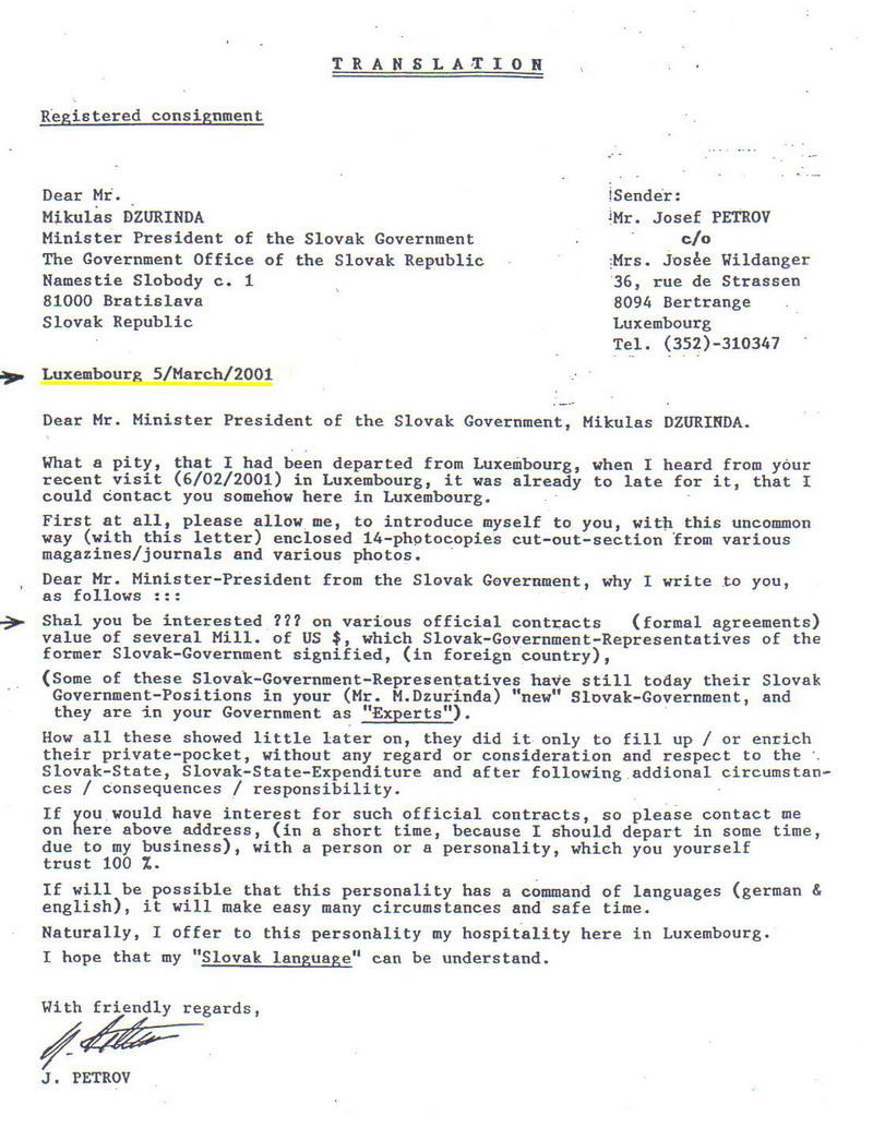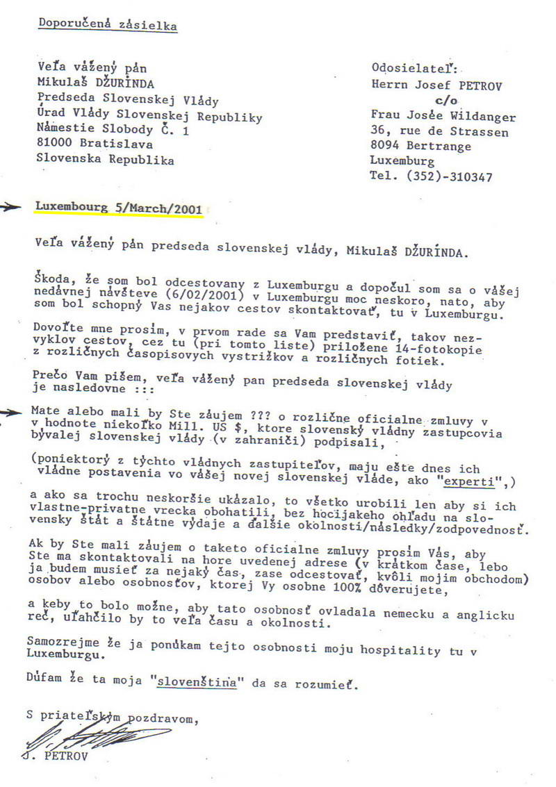 Doporučený list J. Petrova adresovaný býv. predsedovi vlády M. Dzurindovi