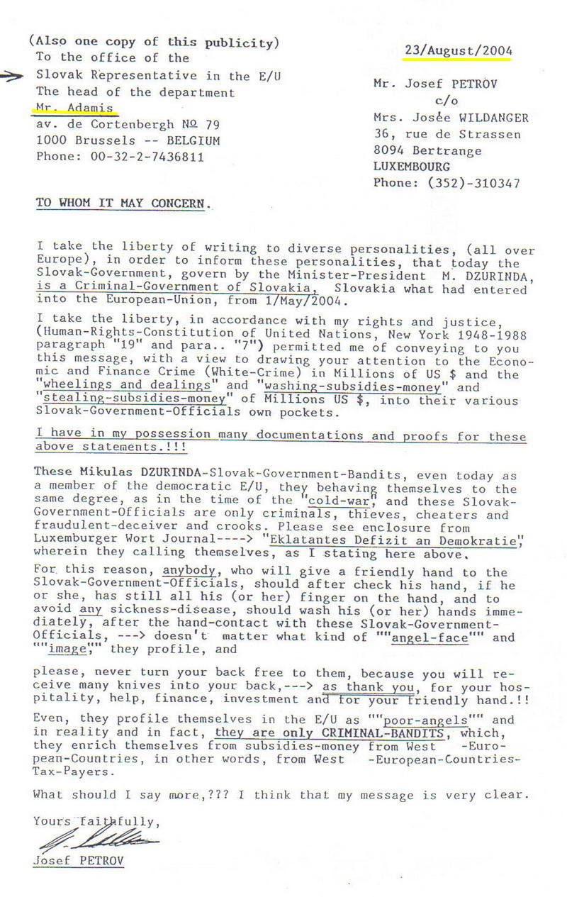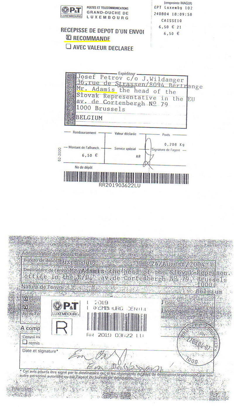 Doporučený list J. Petrova adresovaný býv. predsedovi vlády M. Dzurindovi