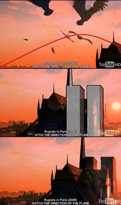 Scéna z filmu Rugrats In Paris (2000), v ktorej lietadlo letí smerom ku WTC vežiam.