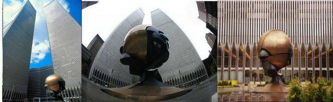 Na hornom obrázku obchodné centrum WTC s točiacou sa guľou (sférou) na námestí,