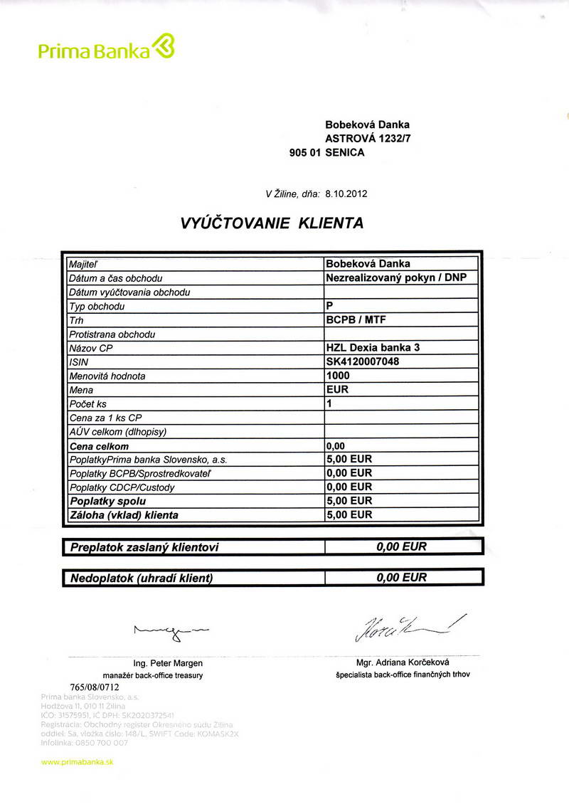 Vzhľadom k tomu, že z osobného majetku dcéry už nie je čo predať, šperky za zlomkovú cenu navždy zostanú v rukách majiteľov záložní, problém pre mňa nastal v momente, keď môj vnuk vytiahol na predaj svoje hodinky montblanc, ktoré dostal ako dar od svojho otca na posledné Vianoce po jeho transplantácii v Monaku. Vedela som, ako ťažko sa vyrovnával s touto situáciou a preto som sa pokúsila zamedziť tomu. Moje úspory ľahšie dostupné už splnili svoj účel, tak som sa pokúsila predať v Prima Banke, tento môj cenný papier v menovitej hodnote 1000 Eur, ale márne. Nezrealizovaný pokyn ma vyšiel na 5 Eur. Uvedomujem si, že je to moja chyba a neviem investovať. Ale nemôžeme predsa všetci všetko vedieť, veď z toho Vy penťáci, džíenťáci, poslanci, štátni úradníci a politici okrem iného žijete a bohatnete.