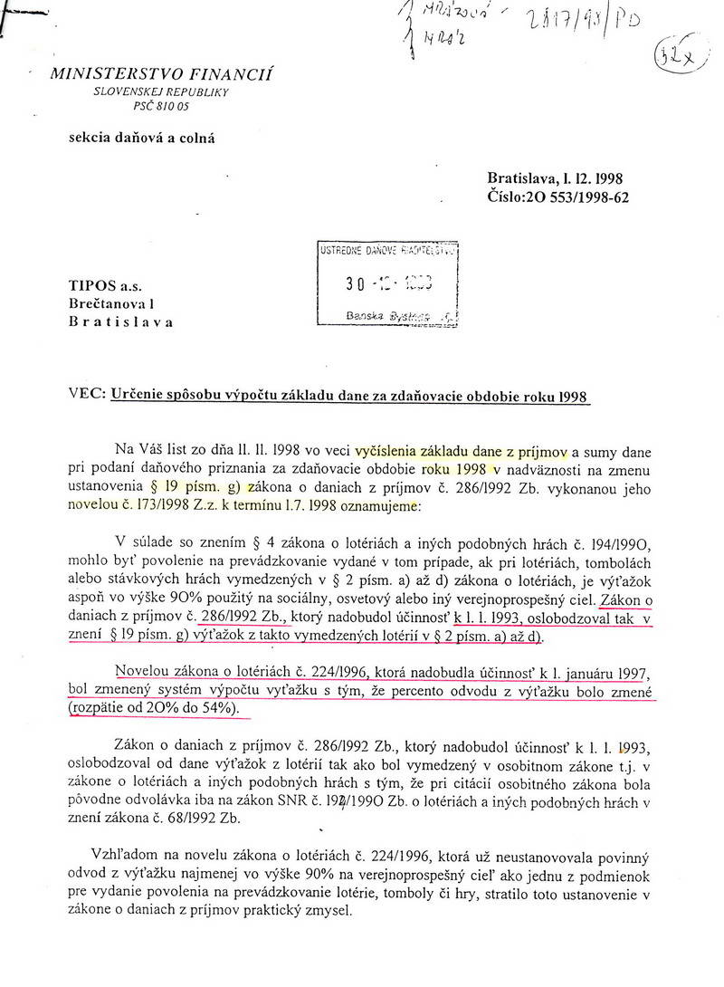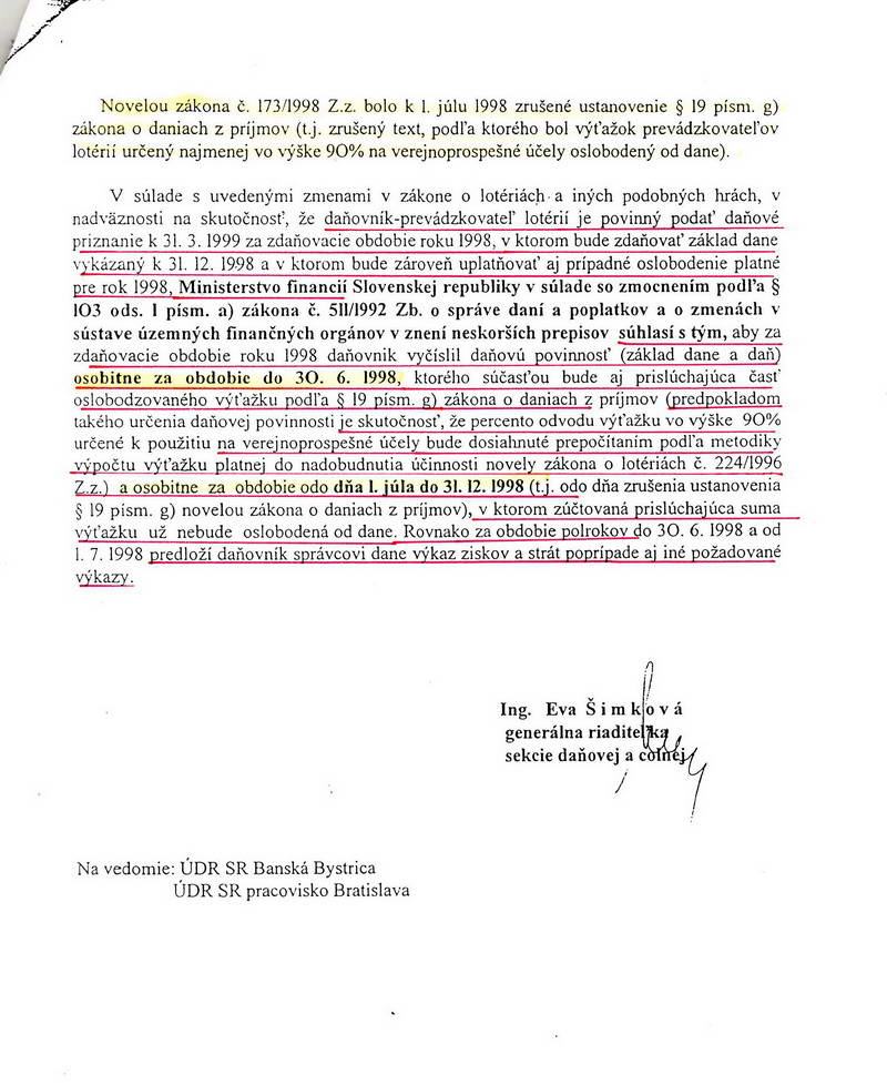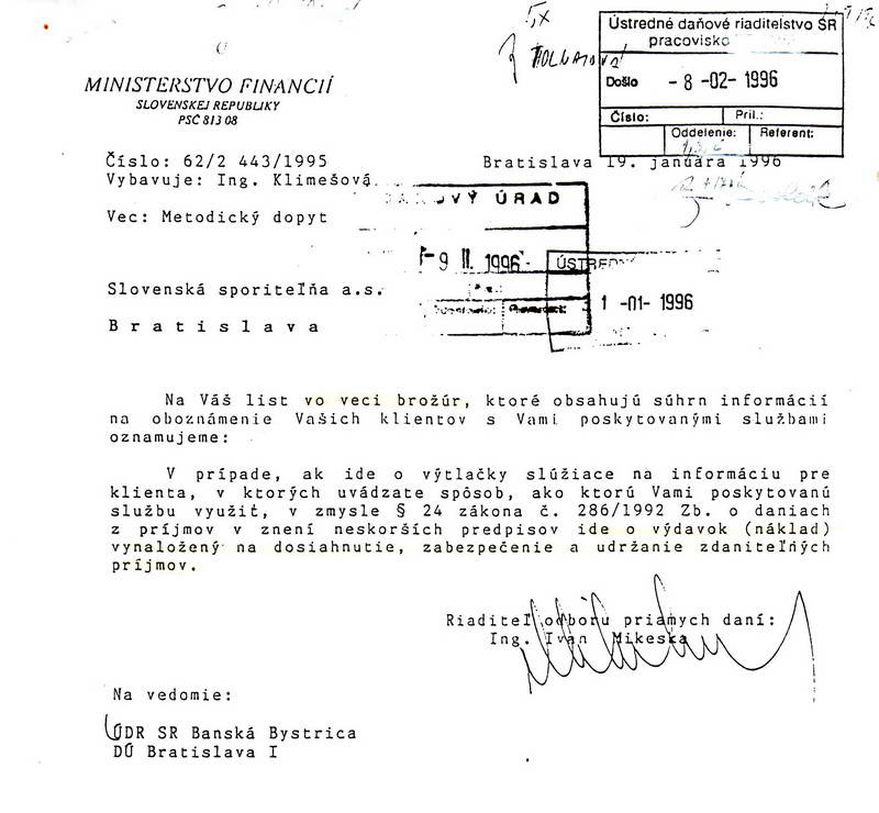 Nároky na odpočty DPH boli akceptované bez daňových kontrol a miestnych zisťovaní, lebo taký bol zákon. Podnikatelia mali prístup cez svojich „ spriaznených „ k vysokým úverom bánk, ktoré nesplácali. Konkurzy spoločností boli často iniciované spriaznenými obchodnými spoločnosťami s účelovo “vyrobenými“ pohľadávkami, daňovú úrady evidovali desiatky fiktívnych spoločností, fiktívne fakturácie a na základe nich fiktívne odpočty DPH. A čo robili vtedy pracovníci Ministerstva financií? Keďže nie je všetko v archívoch a v skartačnom koši, uvediem aspoň dva príklady za všetky. Podnikateľské subjekty si urobili z pracovníkov MF SR bezplatných daňových a účtovných poradcov. Listom z 1.1.1996 na dotaz pod č.j. 62/2/443/1995 odpovedá Ing Klimešová a list podpisuje Ivan Mikeska, riaditeľ odboru priamych daní MF SR Slovenskej sporiteľni a.s. Bratislava, či sú brožúry daňovým, alebo nedaňovým výdavkom. Eva Šimková listom číslo 20553/1998.62 odpovedá TIPOS-u Brečtanova 1 Bratislava, ako sa určuje spôsob výpočtu základu dane. TIPOS a.s. bol vo vlastníctve štátu zastúpený MF SR. Občan by predpokladal, že v manažmente TIPOS-u sedia odborníci, ktorí boli schopní riešiť odbornú problematiku v rámci svojich pracovných náplní. Žiaden účtovník by sa na stoličke nezohrial, ak by takéto triviálne prípady nevyriešil osobne a bol by personálne riešený pravdepodobne odchodom z postu. Pre pracovníkov MF SR asi personálne neriešili nič. Svoje stoličky získali ako všimné od svojich partajníkov za protislužby a tak to aj dopadlo. V tom období totiž bol v plnom prúde realizovaný najväčší zlodejský projekt kupónovej privatizácie a MF SR malo svoj podiel na tejto zlodejine a uchopení moci do rúk skupiny, ktorá prevzala nad nami moc. Ak by boli kompetentní chceli, mohli svoj čas venovať napríklad tomuto, čo sa deje vo VÚB kupóne. Mne ako občanovi to však evokuje spriaznenosť s jastrabmi, a prípravou na lukratívne posty aj v budúcnosti. Vytunelovaný štátny rozpočet, rovnako ako VÚB kupón a ostatné investičné fondy v rokoch deväťdesiatych bol nesporný. Vyvodenie zodpovednosti je asi v nedohľadne.