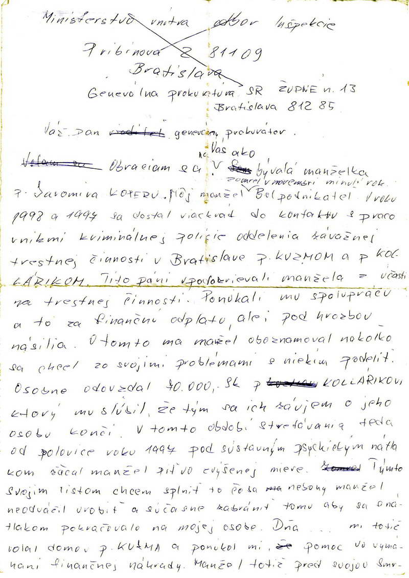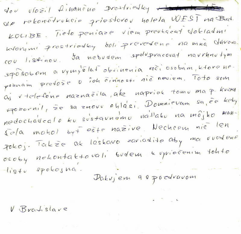 Obraz o tom, aká je osobnosť klienta týchto právnych zástupcov som pochopila v momente, keď som medzi dokladmi našla koncept listu písaný rukou Petra Sýkoru. Dlhú domu som o ňom dcére a vnukovi nepovedala. Vedela som presne, čo nás čaká, chcela som len, aby nestratili aj tú najmenšiu nádej, že otec sa poľudští. Očakávala som preto ústretovosť orgánov činných v trestnom konaní. Zbytočne. Poznali ho aj jeho kumpánov a pokojne nás ponechali napospas smečke vlkov. Nezastaví sa tento ne-človek pred ničím, na svoju obranu použije všetky prostriedky. Rovnako, ako vypísal svojou rukou príkaz na úhradu z účtu DONARUa.s., podpísaného Jaromírom Koperom, potvrdil týmto listom špinu, ktorú je schopný vysypať na hlavu komukoľvek, kto stojí v ceste jeho záujmov. A je nespochybniteľné, že strašiak Donar nie je len strašiakom mojej rodiny. Že rovnako bol nočnou morou Petra Sýkoru a mnohých iných. Takéhoto človeka chráni jeho establišment, ochotný postaviť sa aj proti jeho synovi! List, v ktorom sa podlým spôsobom snažil, či pokúsil obviniť vyšetrovateľa Kuzmu a Kolárika, pracovníkov kriminálnej polície, oddelenia závažnej trestnej činnosti v Bratislave, ktorých sa snažil viniť z úplatkárstva a násilia proti Jaromírovi Koperovi, ktorých sa snažil presvedčiť, že ľudia okolo Petra Sýkoru boli pre Koperu neznámymi a to všetko v mene Marcely Koperovej bez jej vedomia prikladám.