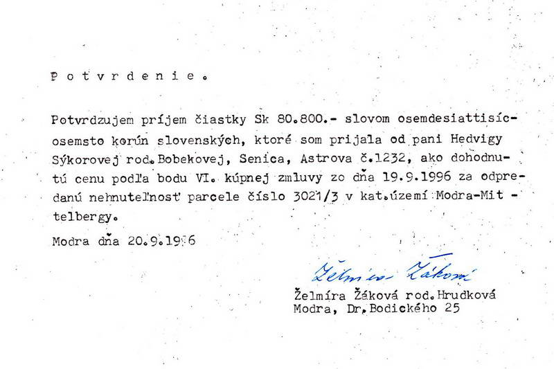 Moja rodina ctí zákon a preto sme doklady nikomu neodcudzili, ale doklady opomenul pred útekom z domu zobrať odporca Peter Sýkora a keďže sme tento dom pripravovali pre exekúciu sľubovanú JUDr. Chovancom, tak sme celý dom prekontrolovali, zhromažďovali veci a syn Petra Sýkoru nechtiac zistil, že je tam ešte nejaký trezor v kotolni, keďže sme ho chceli otvoriť, vybrali sme odtiaľ tri igelitky dokladov. Z úcty k tomu, že P. Sýkora je otcom môjho vnuka som tieto doklady nepoužila proti otcovi môjho vnuka a sú na to vážne dôvody.
