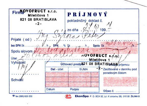Moja emailová korešpondencia s Tomom: Ahoj Tom, je to príjmový pokladničný doklad tuším červenej farby - Novofruct Nové Zámky - vklad Sýkoru do pokladne 1 mil, alebo 11 mil.Sk. Už si nepamätám. To v tých bankových dokladoch nie je :)