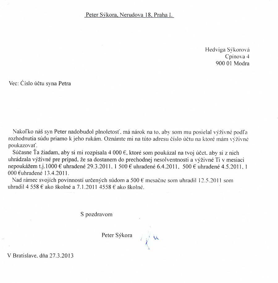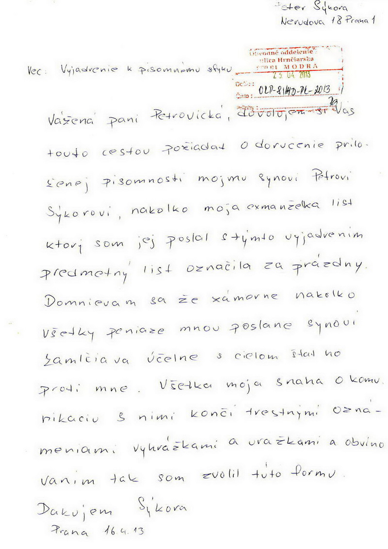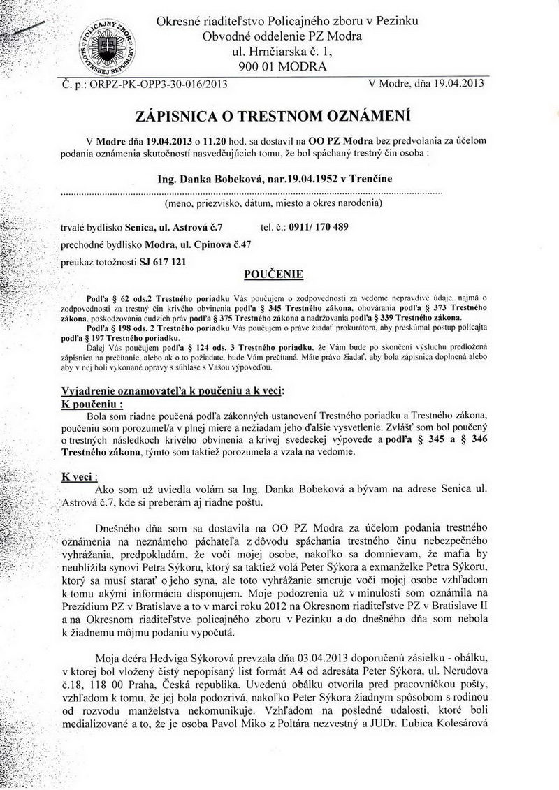 Svedectvo bývalej mafiánovej svokry - 47. časťMafiozo Peter Sýkora robiaci najšpinavšiu prácu pre mafioza Zoroslava Kollára usvedčený z klamstvaJUDr. Boris Chovanec – zločinec a netvor v ľudskej podobe v Správnej rade TASR Mafiozo Peter Sýkora, ktorému zobe z ruky skorumpovaná sudcovská verbež na Krajskom súde v Bratislave, ktorá robí všetko pre to, aby jeho syn naďalej nevidel ani cent z výživného, ktoré mu bolo určené Okresným súdom v Pezinku. Asi si musí byť veľmi istý, keďže sa do korumpovania takýchto sudcov vrážajú ťažké peniaze a mafia už dopredu vie, aký bude výsledok zo strany súdu, samozrejme v ich prospech a ich zisky budú desaťnásobne či viacnásobne väčšie ako sumy, ktoré boli vrazené do podplatenia takejto sudcovskej mafie na Krajskom súde v Bratislave. Pripojím jednu takú názornú ukážku telefonického rozhovoru mafioza Petra Sýkoru so sprostredkovateľom XY, z nedávnych časov, ohľadom sumy idúcej na podplatenie v slovenských korunách. „Koľko hovoríš, že ich je v senáte? Aha, tri kusy, dobre, teda na hlavu 2,5 milióna. V pohode, rozhodnutie už poznám.“ Keďže sme dostali ďalšiu informáciu, že Zoroslav Kollár naďalej chce vyplatiť odmenu za likvidáciu Ing. Danky Bobekovej a jej dcéry Hedvigy, hoci nie každému z okolia Zoroslava Kollára sa to páči. A chcel by som odkázať aj jeho šéfom z Penty ako aj tej druhej finančnej skupine J&T, aby ho trochu umravnili. Peter Sýkora si musí uvedomiť, že aj keď sa voči exmanželke a synovi zachoval ako tá najposlednejšia špina, za pomoci zločineckého a skorumpovaného Slovenska, teda tých, čo tento štát riadia, ich zraziť na kolená, nemožno sa čudovať ich zúfalej reakcii. Neskôr o tom bude podrobne hovoriť článok: „Sila“ a sila mafie. Ako som už naznačil, Peter Sýkora s podporou zločinecko-zlodejského štátu a skorumpovanej či úplatnej sudcovskej mafie robí všetko pre to, aby exmanželku a syna dohnal až k ekonomickému dnu – ekonomickej smrti. A že metódy si pritom nevyberá, vrátane klamania štátnych orgánov – polície, si tentoraz názorne zdokumentujeme. Možno, viacerí z Vás, keď si tieto dokumenty pozrú, ktoré ho usvedčujú z totálneho klamstva, či už ním písaného listu policajtke v Modre či hrubého osočovania exmanželky, možno si aj položíte otázku, či mu netransplantovali tú pečeň z nejakej šialenej kravy? Ing. Danka Bobeková ![]() ![]() ![]() ![]() ![]() |