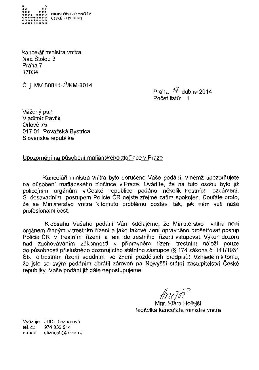 v druhej polovici februára 2014 som adresoval otvorený list českému premiérovi Mgr. Bohuslavovi Sobotkovi. (zasielam kópiu) Z poverenia pána predsedu vlády mi odpovedala riaditeľka Sekcie kabinetu predsedu vlády pani Běla Hejná. (zasielam kópiu)