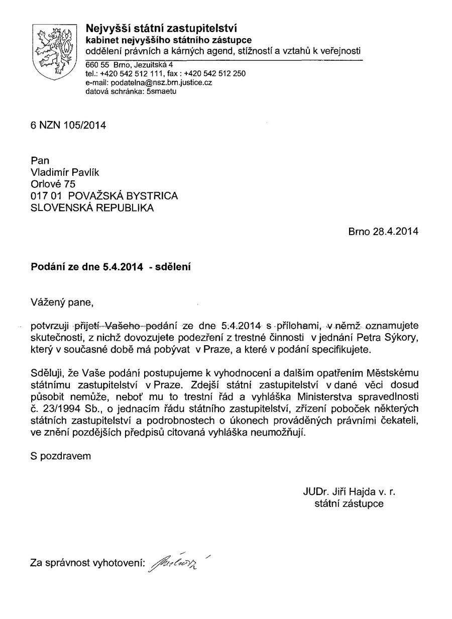 Z odpovede, ktorú som dostal, mám taký pocit, že pán premiér musí byť len nejakým príveskom, ktorý nemal odvahu ani upozorniť na zasadnutí vlády ministra vnútra a najvyššieho štátneho zástupcu na tieto, podľa môjho názoru, mimoriadne závažné fakty ohľadom pôsobenia mafiánskeho zločinca Petra Sýkoru v Prahe. Chcem veriť, že pre Vaše inštitúcie nebude problém ho vypátrať v Prahe, prípadne v ČR, keďže na Slovensku je na neho vydaný zatykač za neplatenie výživného. Keďže sa jedná o chránenca zakladateľa konkurznej mafie na Slovensku, Zoroslava Kollára, ktorý už vyše 18 rokov úspešne podniká v Českej republike, že to nebude mať na Vás žiadny vplyv, aj keď v zločineckom a mafiánsko-gaunerskom Slovensku majú svojich ľudí v riadiacich zložkách polície, ktorých si tam dosadila zločinecká smerácka mafia, aby spoločne kryli takýchto lotrov.