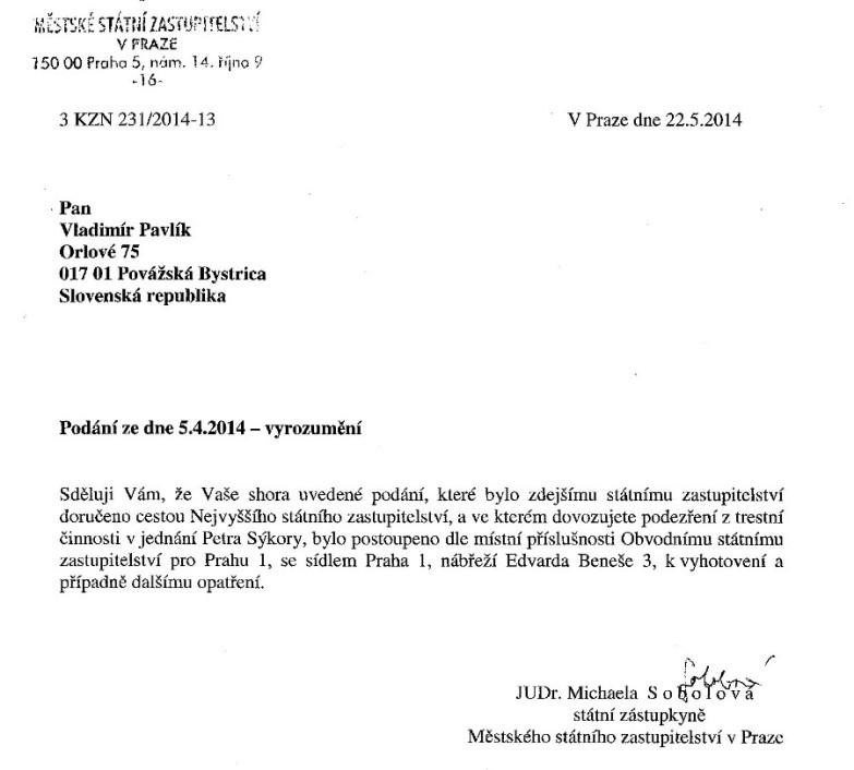aby sme si upresnili a porozumeli o čo mi v skutočnosti ide, zasielam Vám kópiu listu adresovaného Ministerstvu vnútra ČR a Najvyššiemu štátnemu zastupiteľstvu ČR, ako aj rozhodnutie Okresného riaditeľstva PZ v Pezinku a Okresnej prokuratúry v Pezinku ohľadom mafiánskeho zločinca Petra Sýkoru na ktorého bol vydaný zatykač pre neplatenie výživného a ktorý toho času podniká aj v Prahe. Hoci sa menovaný voľne pohybuje po Slovensku a Čechách, skorumpovaná slovenská polícia v rukách zločineckej smeráckej mafie nie je schopná ho vypátrať, lepšie povedané, nechce ho vypátrať. Chcem veriť, že Vám v Prahe sa to podarí. Ja nežiadam od Vás, aby Ste prešetrovali ekonomickú trestnú činnosť tohto mafiánskeho zločinca v spolupráci so zločineckou smeráckou mafiou pri okrádaní Slovenska o miliardy korún, napr. s ministrom obrany Martinom Glváčom, Fedorom Flašíkom, kde boli napr. likvidované aj biele kone, ja len chcem, aby bol vypátraný jeho pobyt v Prahe, čo by nemal byť pre českú políciu problém a bol vydaný na Slovensko.