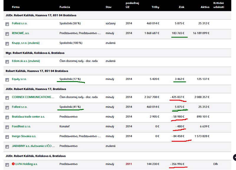 http://blog.hlavnespravy.sk/303/suboj-matovickalinak-k-o-v-priamom-prenose/ Igor Matovič svojho súpera Roberta Kaliňáka v relácii o 5 minút 12 ( 14.2.2016) knokautoval v priamom prenose. Snáď je každému občanovi po tejto relácii jasné, prečo sa pozvaný predseda slovenskej vlády Robert Fico diskusie nezúčastnil. Po dnešku sa už určite ani žiadnej podobnej nikdy nezúčastní. Bojí sa odhalenia v priamom prenose. http://www.finstat.sk/spolocnici-konatelia?query=robert+kalinak Spoločnosťou, ktorá má vyššie zisky, je iba spoločnosť Renomé a.s.. V nej však Kaliňák pôsobil iba v rokoch 2001-2003. V ďalšej ziskovej spoločnosti Equity s.r.o. pôsobil iba do roku 2012. Stratovými firmami sa nateraz zaoberať nebudeme, aj keď tie čísla sú ohromujúce a dokazujú, že minister vnútra je na podnikateľskom poli babrák a neschopný človek. Takže jediná zisková spoločnosť, ktorá odviedla dane, je spoločnosť FoRest s.r.o.. Za rok 2014 to bolo vo výške 1847 Eur, čiže cca 55 000 korún , kde je však Kaliňák 50% spoločníkom spolu s iným podivným ministrom Jánom Počiatkom. Takže z oficiálne dostupných zdrojov odviedol Robert Kaliňák na daniach 23 000 slovenských korún. Kde sú tie zvyšné 2 977 000 ? Pýtajte sa, páni novinári!