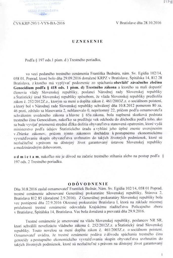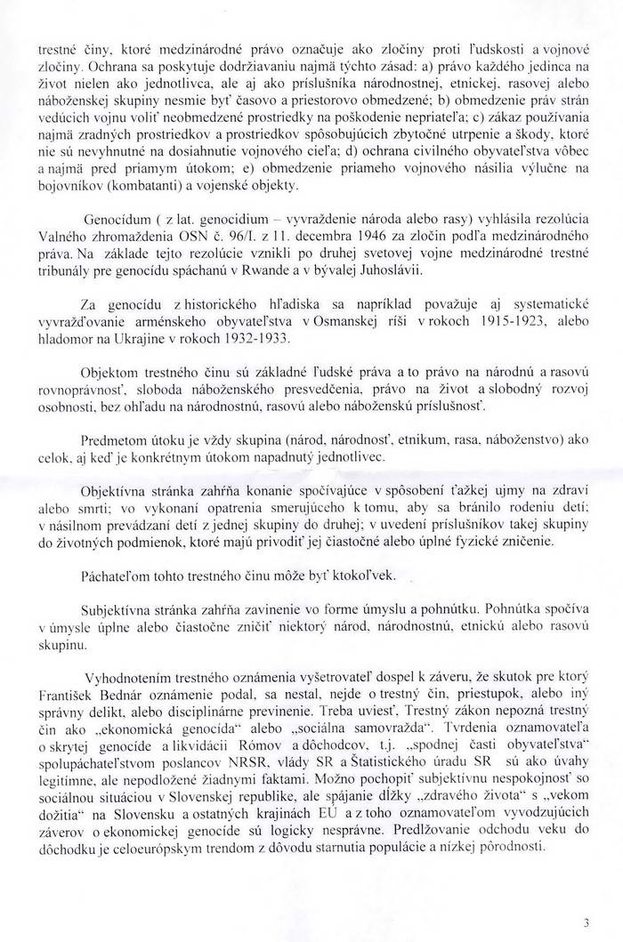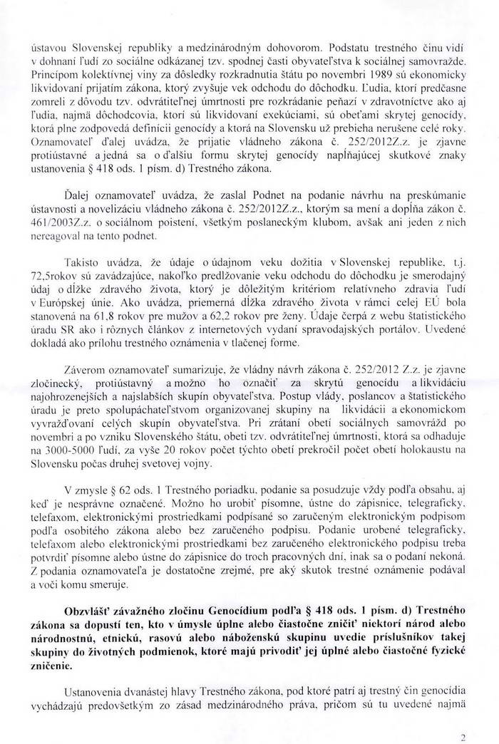 Trestné oznámenie podávam z dôvodu spáchania trestného činu genocídy a postupného ekonomického vyvražďovania skupín obyvateľstva uvrhnutím do takých životných podmienok, ktoré sú nezlučiteľné s právom na dôstojný život garantovaný ústavou Slovenskej republiky a medzinárodným dohovorom.