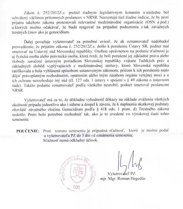 Vyšetrovateľ PZ dospel k záveru, že podnet pre trestný čin genocídy skupín obyvateľstva Slovenskej republiky prijatím zákona č. 252/2012 Z.z. mal smerovať na Ústavný súd Slovenskej republiky