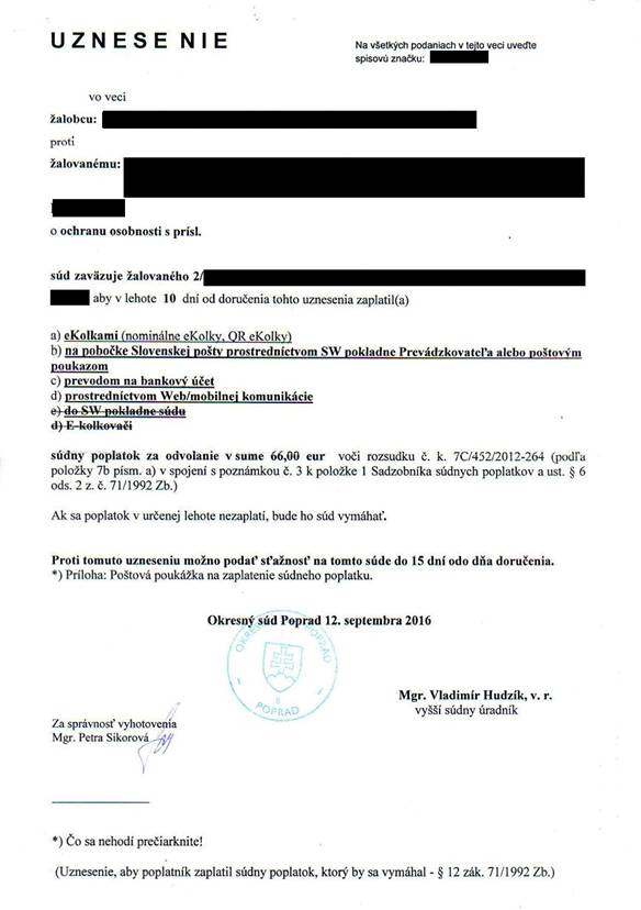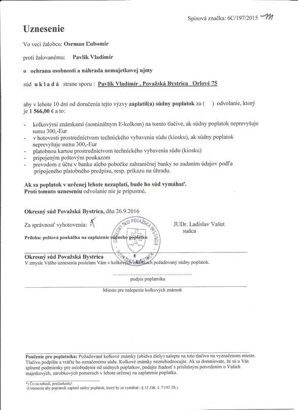 Asi po troch mesiacoch od začiatku súdneho sporu mi bolo naznačené, že za dotyčný článok zaplatím vlastným životom – a zločineckí sudcovia Jankovský a Vašut dostali požehnanie z najvyšších miest štátu, v tom období napr. od mafiánskeho gaunera Boreca, z ktorého zločinecká smerácka mafia urobila ministra spravodlivosti, a jeho štátnej tajomníčky Jankovskej so zločineckou a kriminálnou minulosťou, toho času poslankyňa za zločineckú smerácku mafiu. Nechať ma zavraždiť by bolo pre nich nerentabilné, tak sa ma pokúšajú pripraviť o život cez drastické porušovanie zákonov tak cynickým spôsobom, čo už po preštudovaní otvorene hovoria aj ľudia, ktorí boli bývalí sudcovia a prokurátori, toho času vykonávajú advokátsku činnosť. Ako ďalší príklad flagrantného zneužívania zákona a arogantného postupu predkladám uznesenie vydané osobne sudcom Vašutom bez možnosti podania sťažnosti, hoci sa o poplatkoch pri odvolaniach rozhoduje vyšší súdny úradník, kde za odvolanie voči jeho paškvilu mi určil súdny poplatok 1 566 eur do čoho započítal 3% zo sumy 50 000 eur o ktorej nezákonne rozhodol na konaní podľa nového CSP bez mojej prítomnosti, pričom som bol riadne ospravedlnený. Zdôvodnenie: Súdny poplatok za odvolanie v sume 66 eur voči rozsudku č. k. ...... (podľa položky 7b písm. a) v spojení s poznámkou č. 3 k položke 1 Sadzobníka súdnych poplatkov a ust. § 6 ods. 2 z. č 71/1992 Zb.) v uznesení sudcu Vašuta chýba! Ako je možné, že vo veci uznesenia iného Okresného súdu možno proti uzneseniu o súdnom poplatku za podanie odvolania podať sťažnosť do 15 dní odo dňa doručenia, ale na Okresnom súde v Považskej Bystrici PROTI TOMUTO UZNESENIU ODVOLANIE NIE JE PRÍPUSTNÉ!!! Je všeobecne známe, že z dôvodu odbremenenia sudcov kvôli prieťahom, administratívne a iné úkony prešli do kompetencii vyšších súdnych úradníkov. V mojej veci však o súdnom poplatku rozhodol priamo sudca Vašut, navyše nezákonne. Preto sa pýtam, je Ministerstvo spravodlivosti SR svojprávny štátny orgán s kompetenciami, alebo je len nekompetentným podporovateľom skorumpovanej zločineckej zberby na súdoch, ak sa takéto niečo môže diať? Vladimír Pavlík