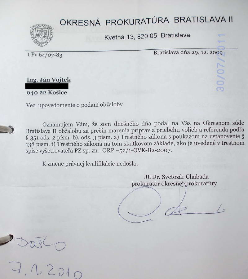 Prvú časť sme ukončili autentickým dokumentom o vznesení obvinenia pod ČVS: ORP-52/1-OVK-B2-2007, ktoré voči Ing. Vojtekovi vypracovala vyšetrovateľka Okresného riaditeľstva PZ Bratislava II, Úradu justičnej a kriminálnej polície Bratislava npor. JUDr. Helena Achbergerová za úmyselný prečin, a obžalobu na Okresný súd Bratislava II podal prokurátor Okresnej prokuratúry Bratislava II, JUDr. Svetozár Chabada dňa 29. 12. 2009, č.k. 1 Pv 64-07-81 podľa § 234 ods. 1 Trestného zákona, pretože, citujem: „od presne nezisteného času až do 6. 10. 2006 v Bratislave na Mierovej ulici č. 21 kedy predložil kandidátsku listinu spolu s petičnými hárkami s podpismi 540 voličov na podporu svojej kandidatúry na voľby starostu Mestskej časti Bratislava – Ružinov, predstieral splnenie podmienok kandidatúry, ktorá bola pre daný volebný obvod limitovaná minimálnym počtom kandidatúry, ktorá bola pre daný volebný obvod limitovaná minimálnym počtom 400 podpisov potenciálnych voličov, zapísal do petičných hárkov najmenej 78 osôb bez ich vedomia a najmenej 202 osôb, ktorých generálie nezodpovedali zoznamom osôb oprávnených zúčastniť sa na voľbách starostu mestskej časti v roku 2006, teda v súvislosti s výkonom ústavných práv, inak hrubým spôsobom maril výkon týchto ústavných práv a čin spáchal závažnejším spôsobom konania – ľsťou, čím spáchal prečin marenia príprav a priebehu volieb a referenda podľa § 351 ods. 2 písm.b) ods. 3písm.a) Trestného zákona s poukazom na ustanovenie § 138 písm. f) Trestného zákona“.