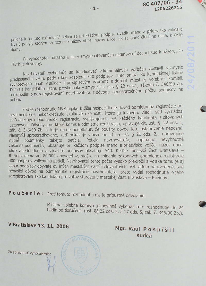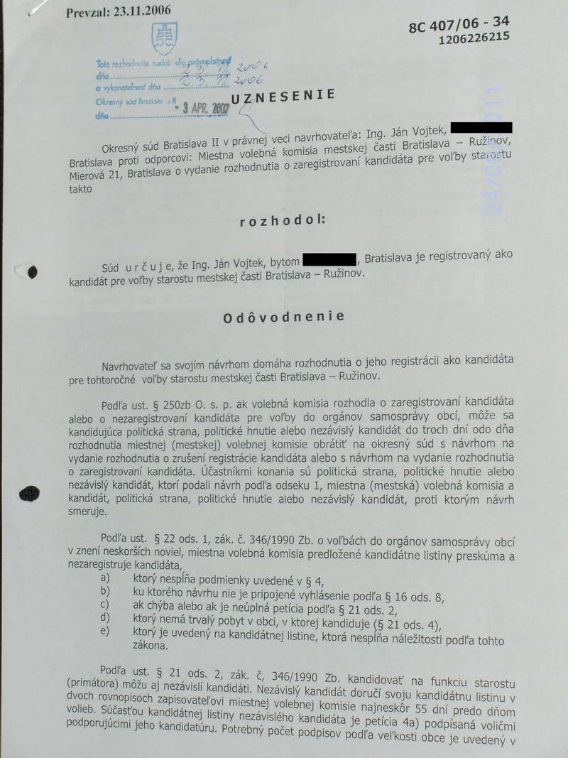 Napriek tomu, že Okresný súd Bratislava II, č.k. 8C 407/06-34 zo dňa 13. 11. 2006 rozhodol právoplatným rozhodnutím Ing. Vojteka zaregistrovať ako kandidáta pre voľby starostu mestskej časti Bratislava – Ružinov, vyšetrovateľka a prokurátor toto svojím hyenizmom absolútne nerešpektovali.