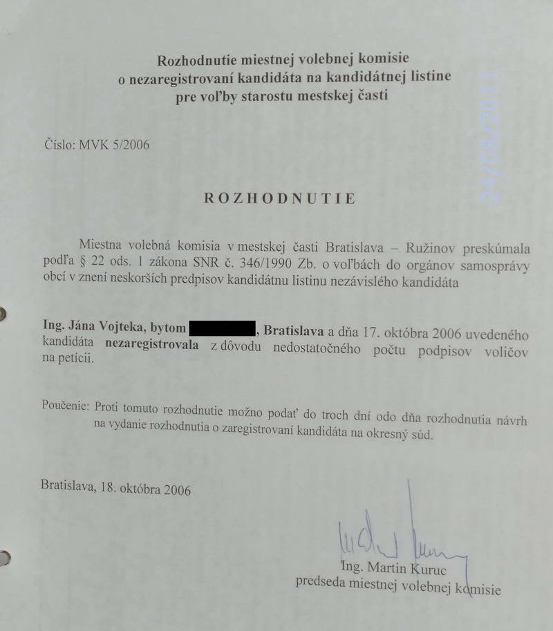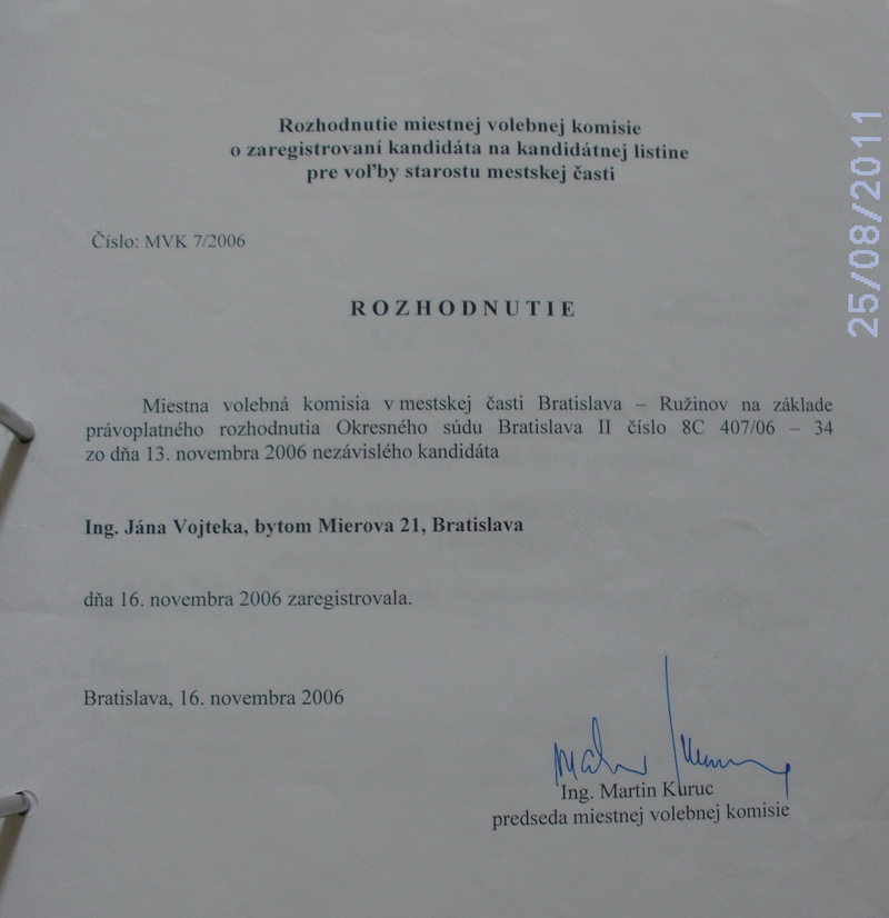 Dňa 18. 10. 2006 predseda miestnej volebnej komisie Ing. Martin Kuruc (SDKÚ-DS), zať prof. JUDr. Jaroslava Ivora, DrSc. (KDH), dekana Fakulty práva Paneurópskej vysokej školy vydal rozhodnutie č. MVK 5/2006 o nezaregistrovaní kandidáta z dôvodu nedostatočného počtu podpisov voličov na petícii. Dňa 16. 11. 2006 vydáva nové rozhodnutie č. MVK 7/2006 o zaregistrovaní kandidáta Ing. Vojteka na základe právoplatného rozhodnutia Okresného súdu Bratislava II, 8C 407/06-34 zo dňa 13. 11. 2006. (Súčasťou článku sú priložené autentické dokumenty).