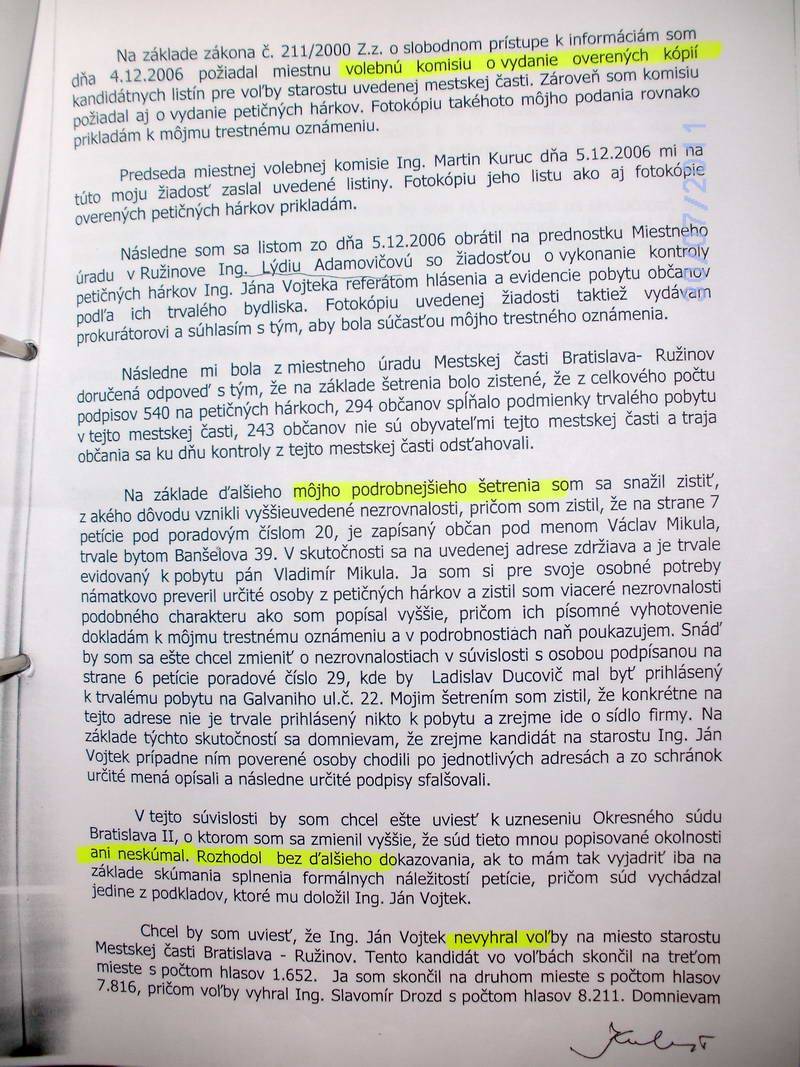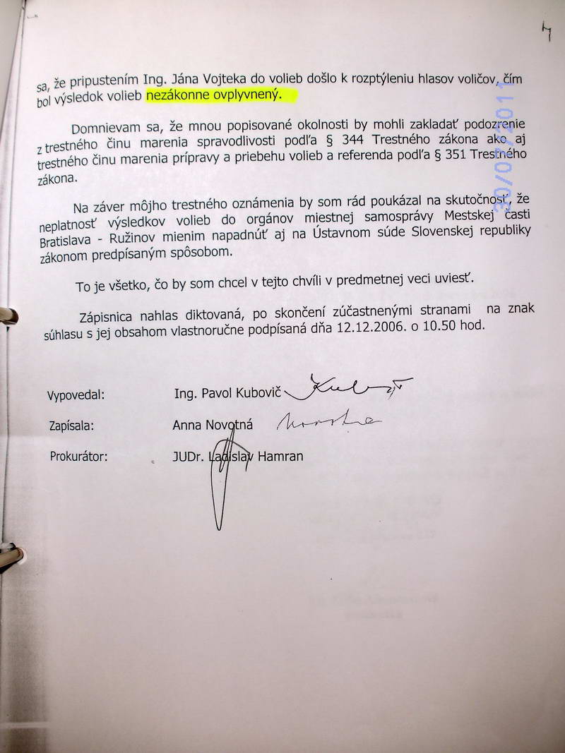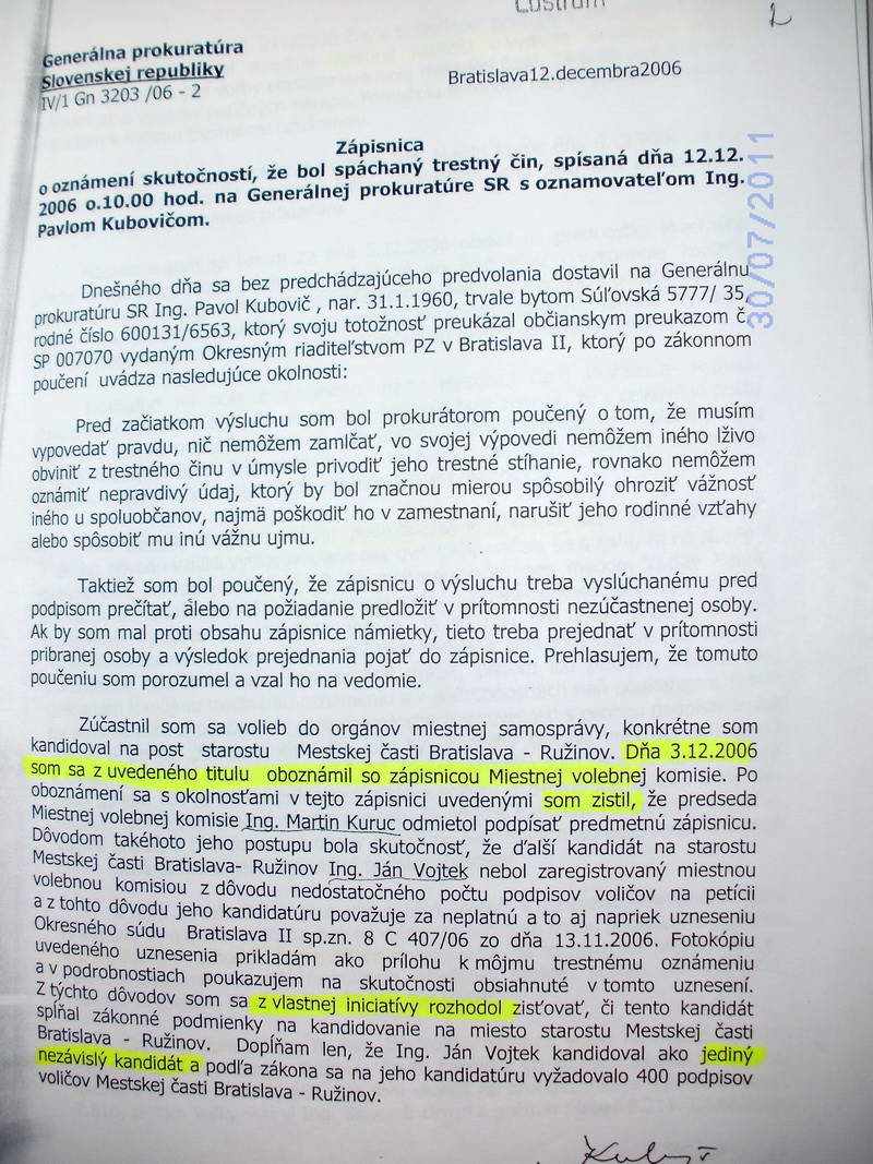 Dňa 12. 12. 2009 o 10.00 hod. podal Ing. Pavol Kubovič na Generálnej prokuratúre SR, č.k. IV/1 Gn/3203/06 u prokurátora JUDr. Ladislava Hamrana na Ing. Jána Vojteka trestné oznámenie zo zneužitých a neprávom získaných informácií. (Autentický dokument je súčasťou článku) Tento prokurátor pracoval od 5. 3. 2003 dočasne preložený na výkon funkcie prokurátora na Úrade špeciálneho prokurátora Generálnej prokuratúry SR! Od 1. 9. 2004 bol dočasne preložený na výkon funkcie prokurátora Generálnej prokuratúry SR, oddelenie majetkovej kriminality!! Možno si položiť otázku, čo má politická činnosť spoločné s majetkovou kriminalitou??