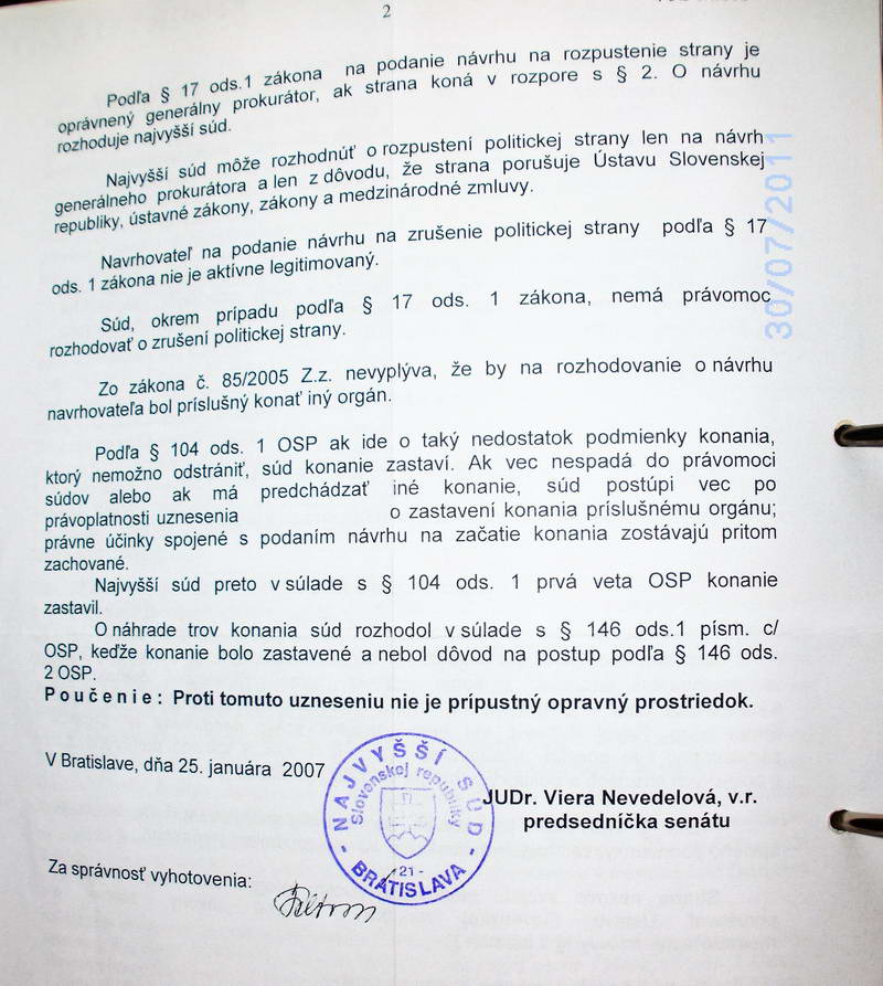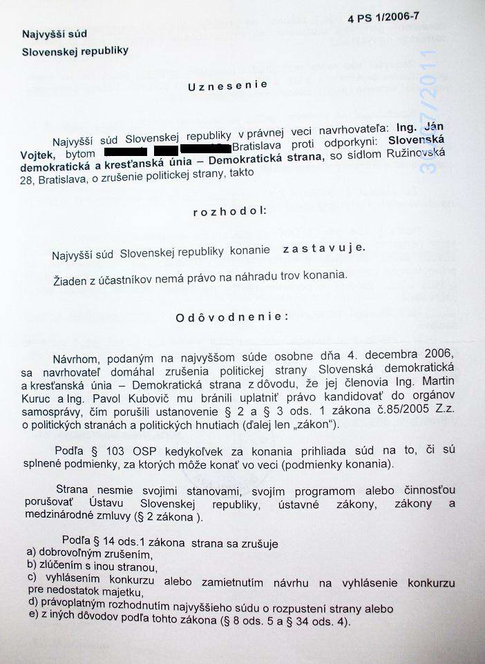 Dňa 25. 1. 2007 predsedníčka senátu Najvyššieho súdu SR JUDr. Viera Nevedelová návrh Ing. Jána Vojteka na zrušenie politickej strany SDKÚ-DS zastavila, číslo konania 4 PS 1/2006-7. (Autentický dokument je súčasťou článku.) Ešte pred tým, dňa 13. 12. 2006, podal sťažnosť na Ústavný súd SR. (Autentický dokument je súčasťou článku.) Dňa 12. 4. 2007 dostal list od svojej advokátky ktorá ho zastupovala pred Ústavným súdom, kde ho ubezpečuje, že všetko je v poriadku. (Autentický dokument je súčasťou článku.)