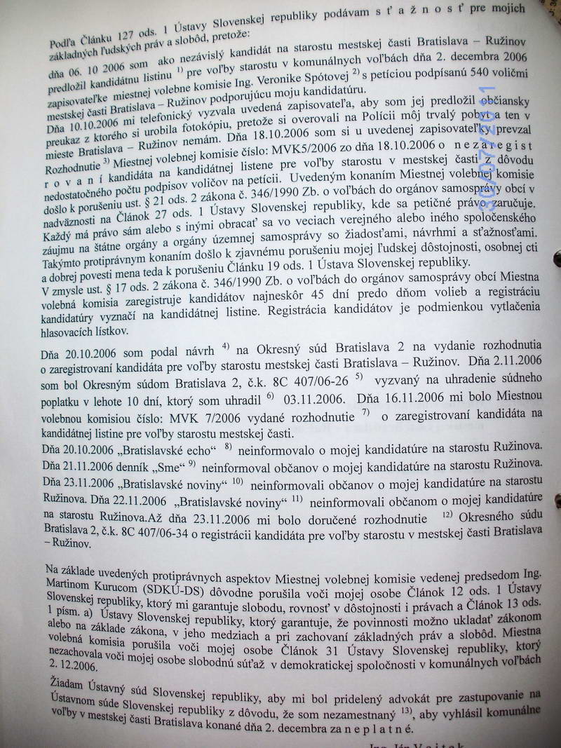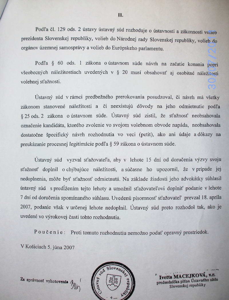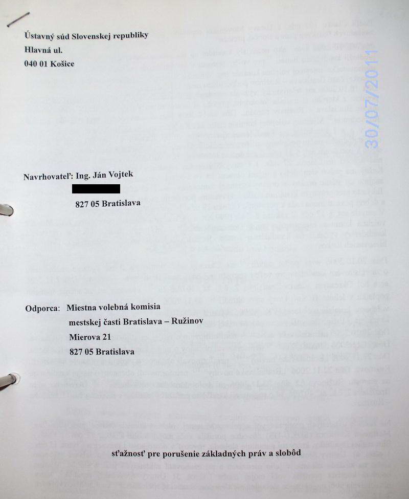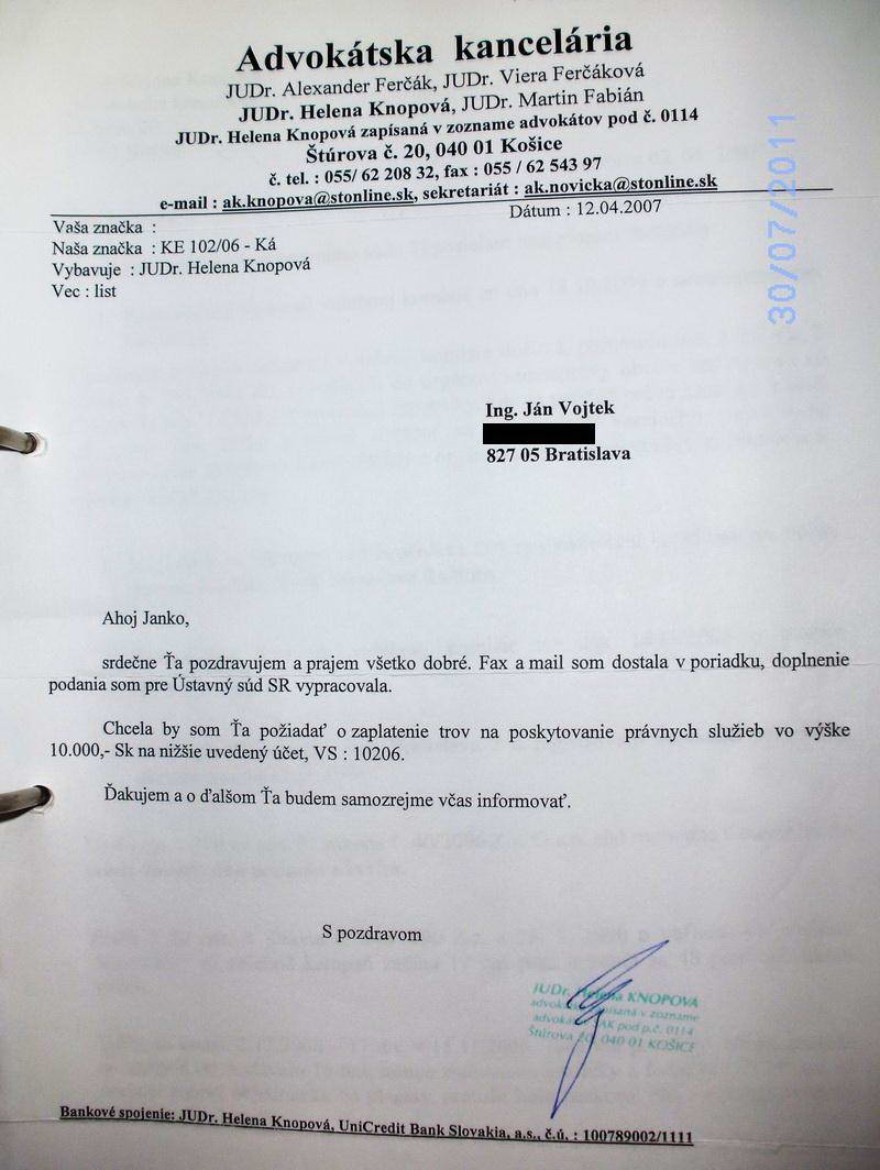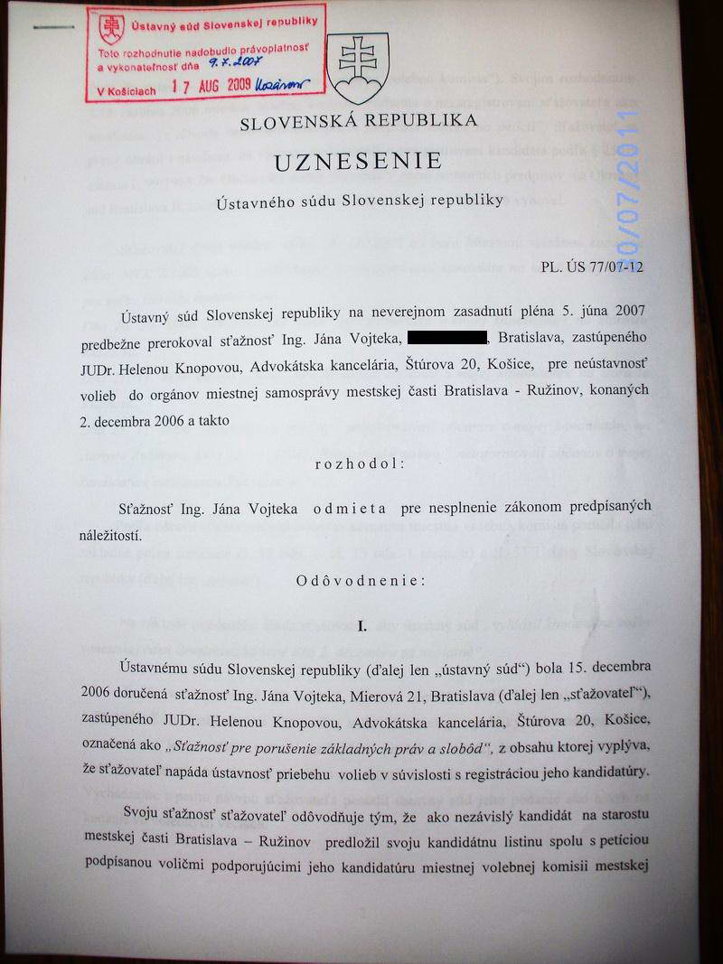 Šokujúcu informáciu Ing. Ján Vojtek zistil pri naštudovaní spisu na Ústavnom súde SR 17. 8. 2009, že dňa 5. júna 2007 rozhodol o zamietnutí jeho podania, pretože zvolená advokátka JUDr. Helena Knopová aj NAPRIEK PREDĹŽENEJ LEHOTE NEDOPLNILA SÚDU POŽADOVANÉ MATERIÁLY!!!