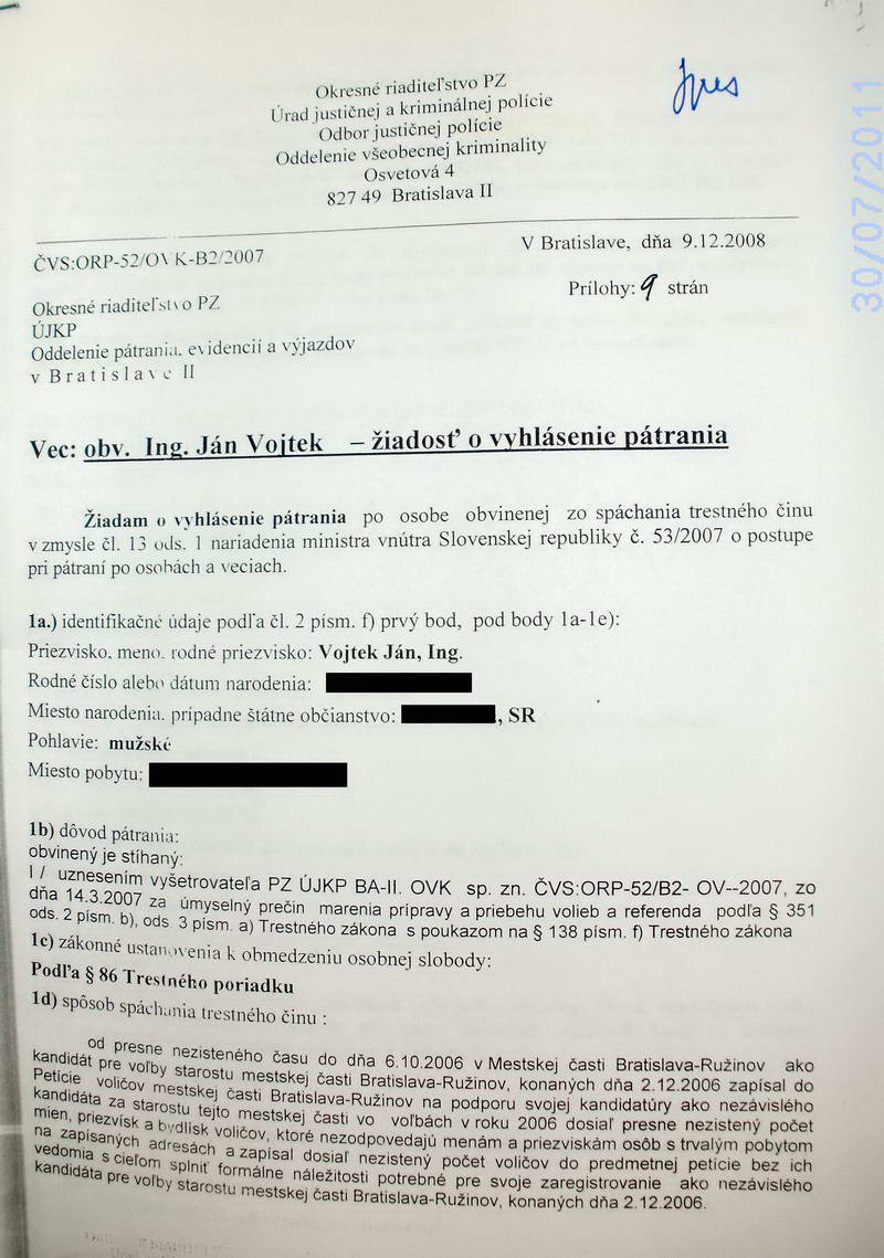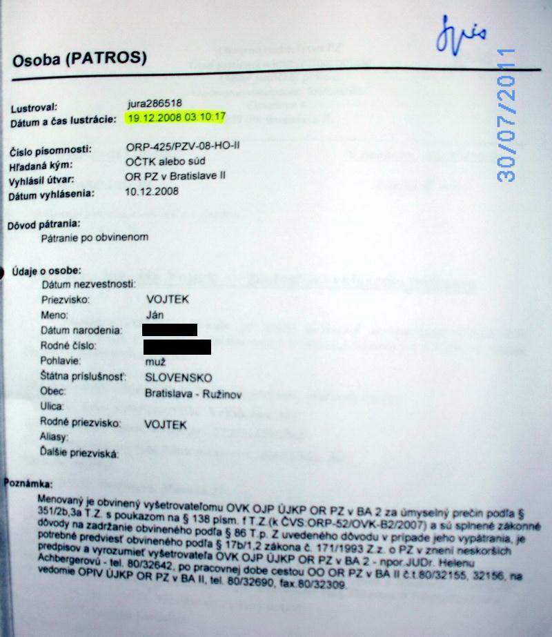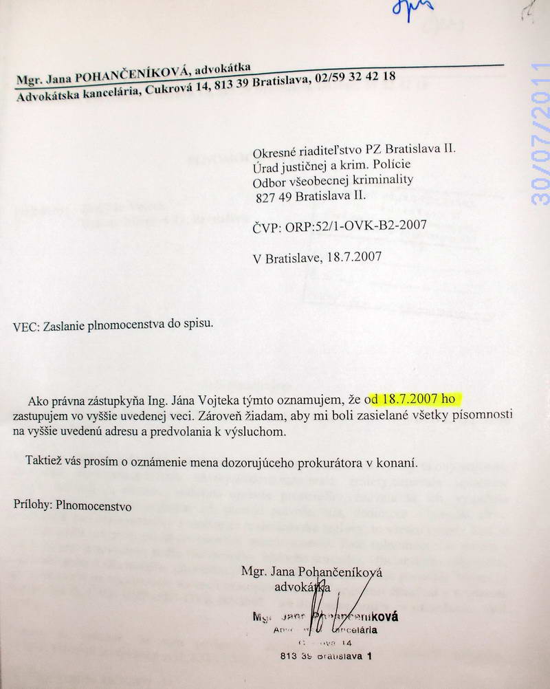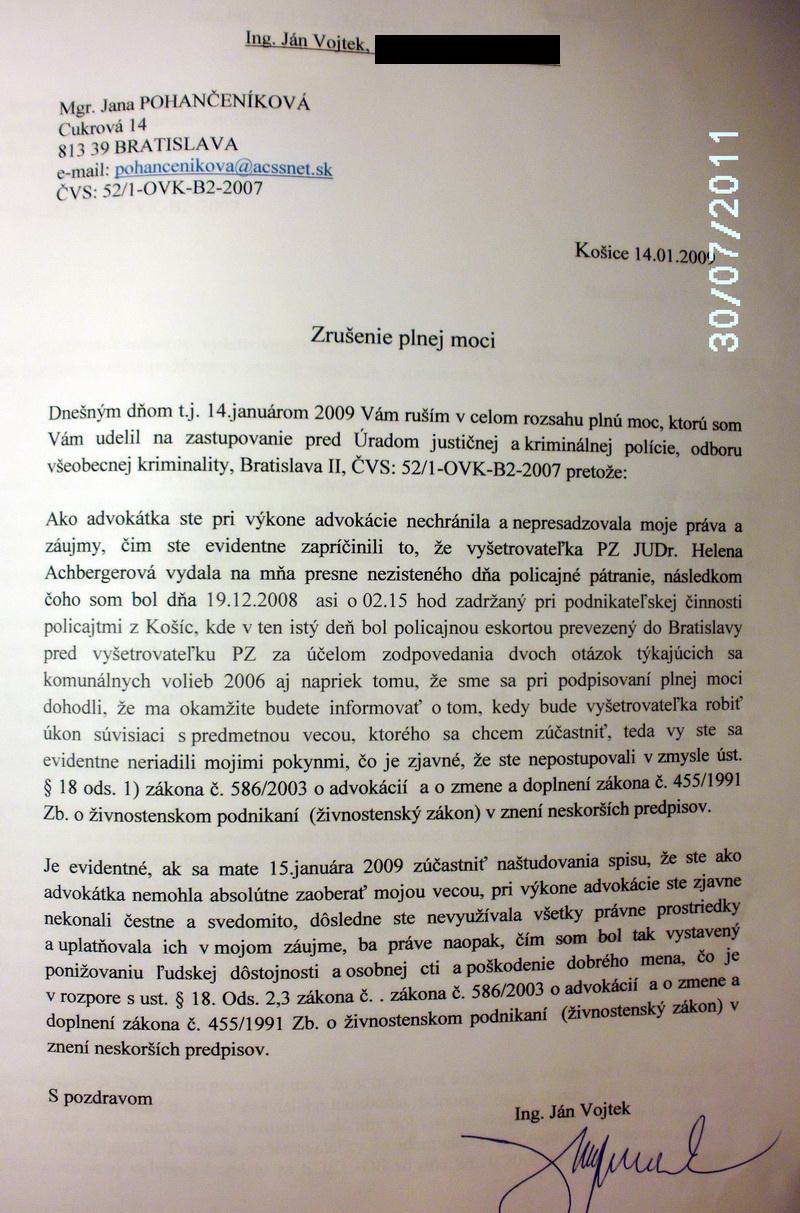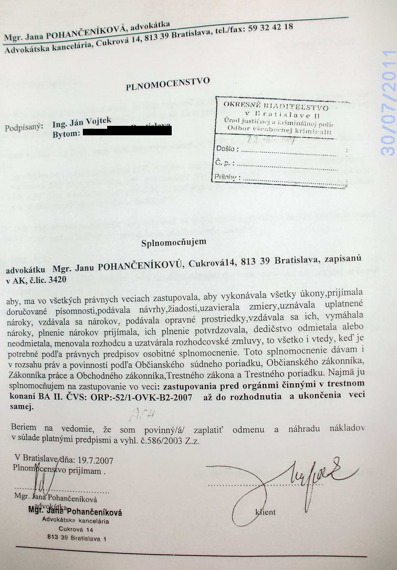 Dňa 19. 7. 2007 Ing. Ján Vojtek podpísal plnú moc Mgr. Jane Pohančeníkovej na jeho právne zastupovanie pred orgánmi činnými v trestnom konaní ČVS: ORP-52/1-OVK-B2-2007, kde v písomnosti adresovanej Úradu justičnej a kriminálnej polície OR PZ BA 2 žiada, aby jej ako advokátke boli zasielané všetky písomnosti a predvolania k výsluchu. Vyšetrovateľka Okresného riaditeľstva PZ Bratislava II, Úradu justičnej a kriminálnej polície, Osvetová 4, 827 49 Bratislava JUDr. Helena Achbergerová nerešpektovala jeho výpoveď zo zápisnice zo dňa 14. 3. 2007, že chce vypovedať v prítomnosti obhajcu, aj napriek tomu, že bol riadne prihlásený na trvalý pobyt v evidencii obyvateľstva, na adresu trvalého bydliska mu nikdy nič neposlala a od advokátky nikdy nežiadala, aby zabezpečila jeho účasť na výsluchu, ALE RADŠEJ PÍSOMNOSŤ POSLALA NA ADRESU, KDE NEBÝVAL A VYHLÁSILA PO ŇOM DŇA 9. 12. 2008 CELOŠTÁTNE PÁTRANIE!!!